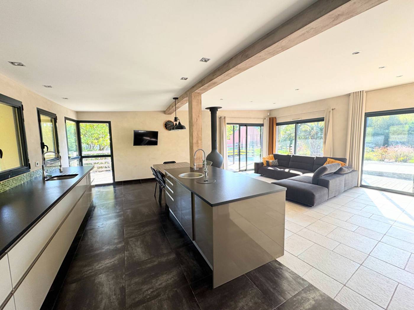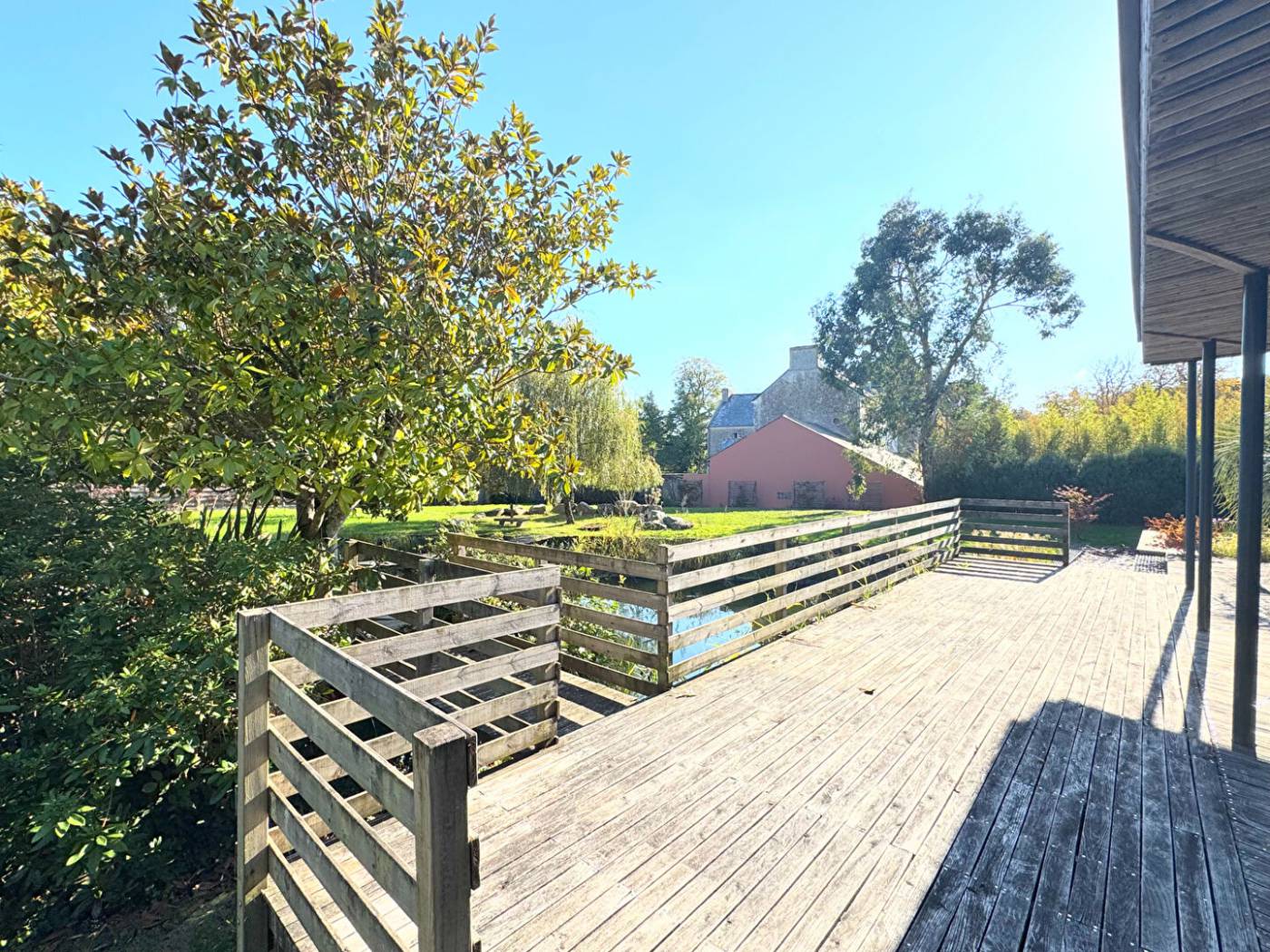 Superbe Maison d'architecte de 258,05 m2 (Loi Carrez) entièrement de plain pied dans un magnifique domaine privé sécurisé - Cette maison offre des volumes généreux et un haut niveau de confort, sur une parcelle totale de 6715 m2 soigneusement aménagée et close comprenant SPA de nage, petit étang et grand terrain jouxtant (non constructible) clos - La maison se compose : Vaste entrée sur patio végétalisé - Grande pièce de vie Sud / Ouest avec cuisine US aménagée / équipée + cheminée suspendue sur grande terrasse bois et terrasse carré avec banquettes - 5 chambres - Espace bureau / sport - Salle de bains - 2 salles d'eau - Lingerie - local technique - Arrière cuisine - Dressing - Nombreux rangements - Salon TV (home cinéma) - Grande allée pour voitures - Grand abri bois