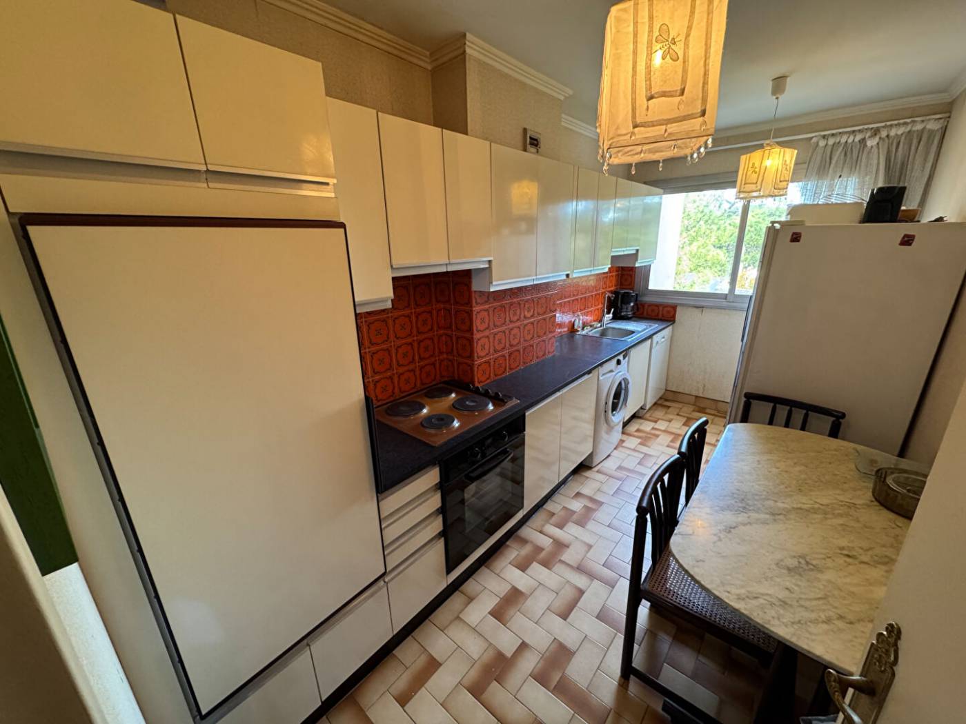 Emplacement calme dans un parc pour ce Type 3 de 84,13 m2 (loi Carrez) à rénover situé au 3ème étage d'une résidence sécurisée bien entretenue avec ascenseur de 1985 comprenant : Entrée sur couloir - Cuisine indépendante carrelée aménagée et équipée avec petit espace repas - WC - Dégagements - 2 chambres avec terrasse - Salon / séjour double traversant avec 28 m2 de terrasse - Garage box - Cave