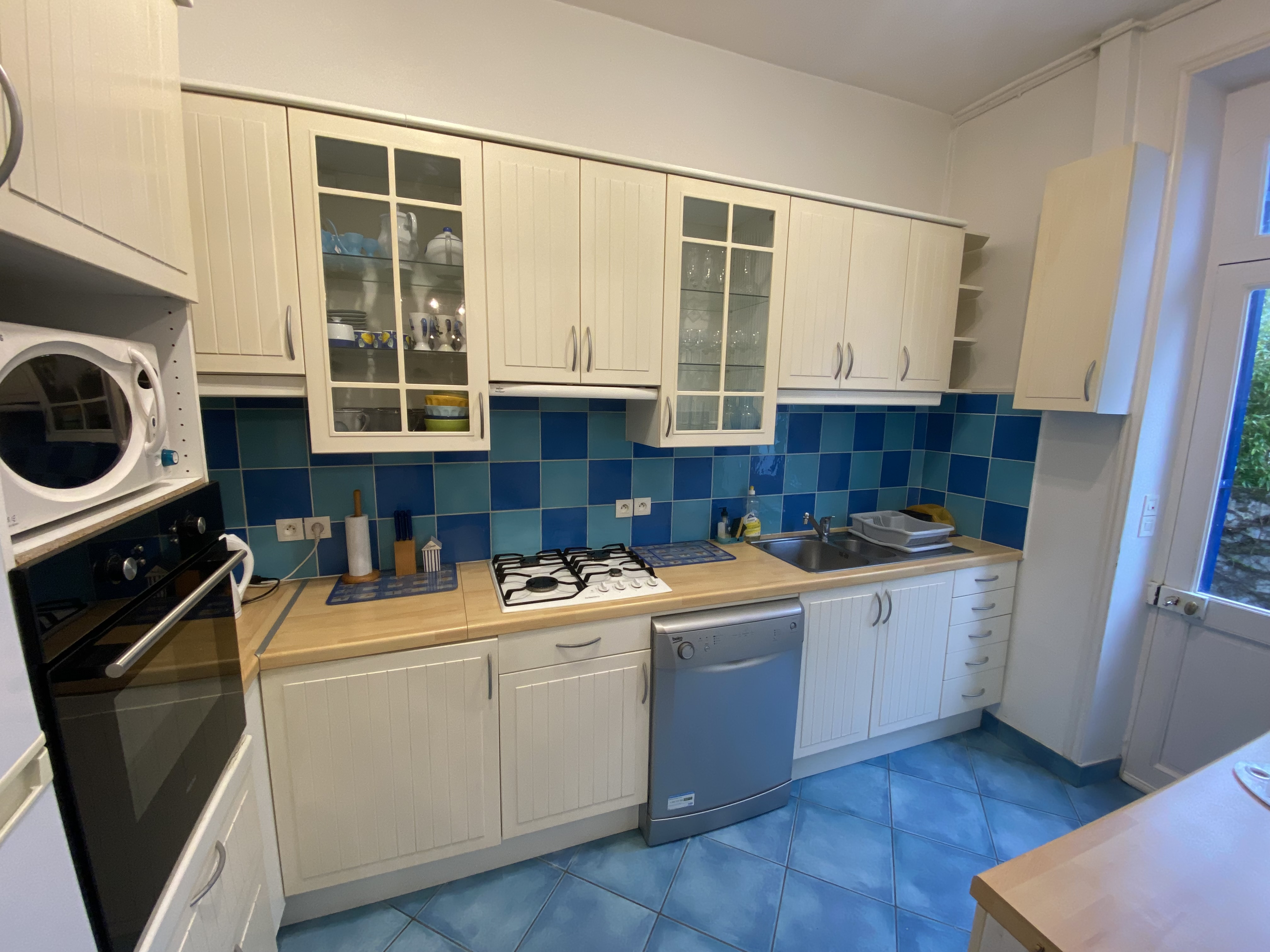 RDC : Entrée - Salon/Séjour expo Sud ouvert sur jardin (TV écran plat avec TNT) - Cuisine équipée et aménagée (4 feux gaz - Hotte - Réfrigérateur/Congel. - Four/Micro-Ondes - Lave-vaisselle) - WC.