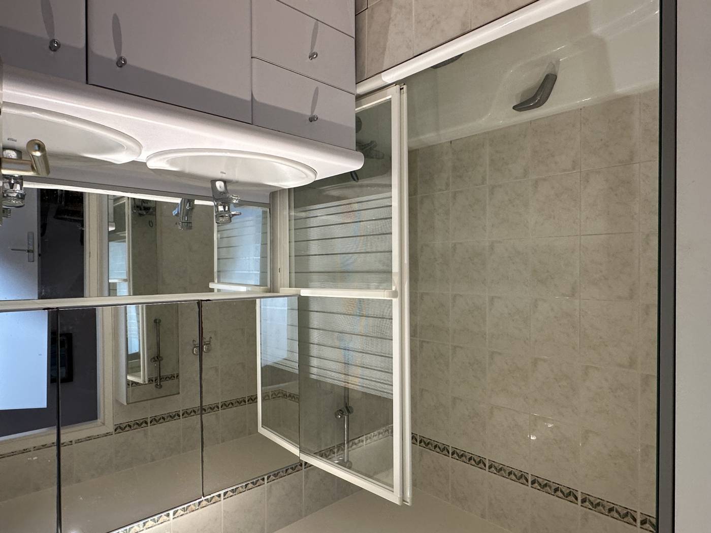 Salle de bain avec double vasque et sèche-serviettes, WC indépendant.