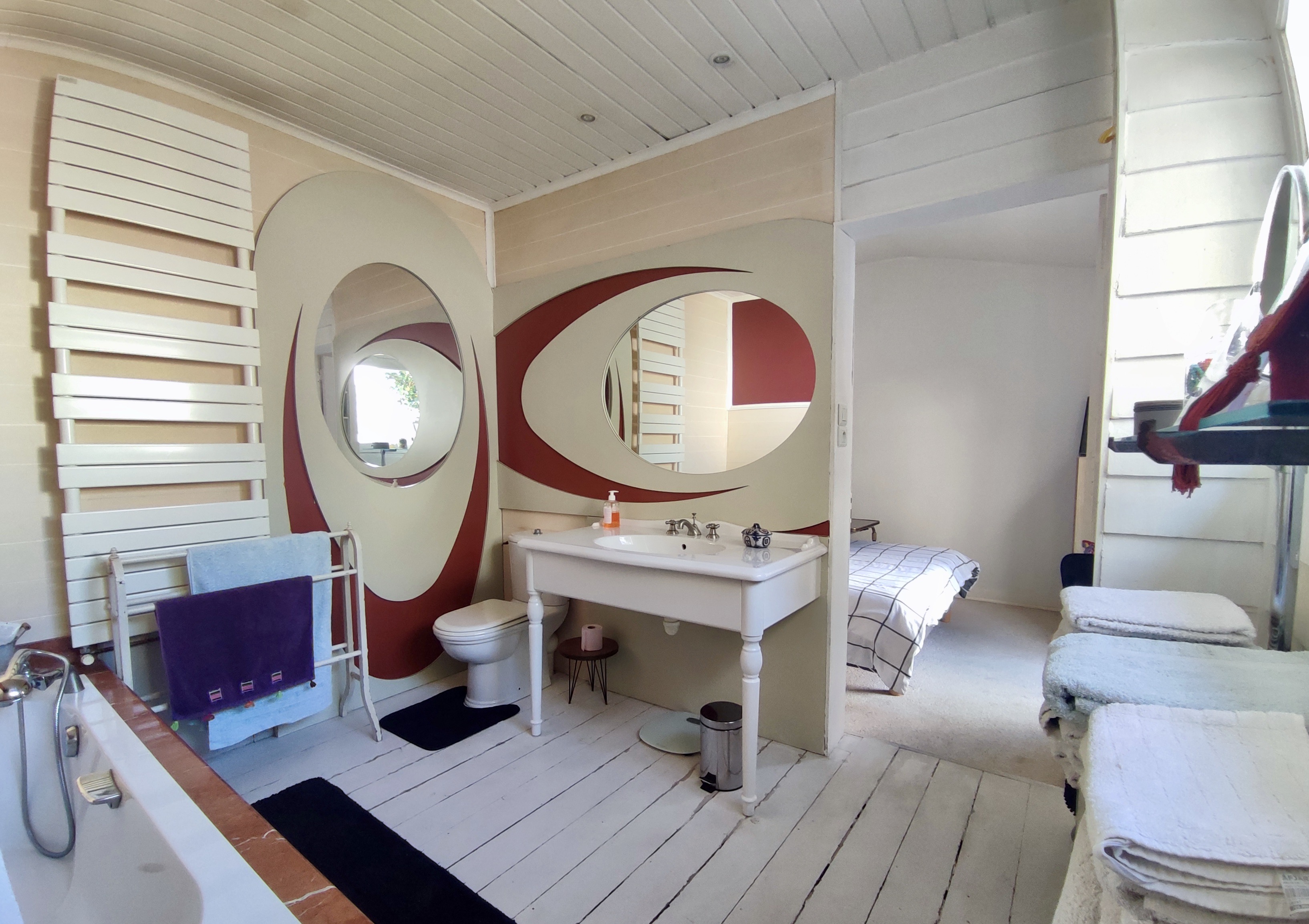 Salle de bain attenante, menant à la chambre 2 (lit 160x190, commode, TV), accessible par la première chambre ou directement par le jardin.