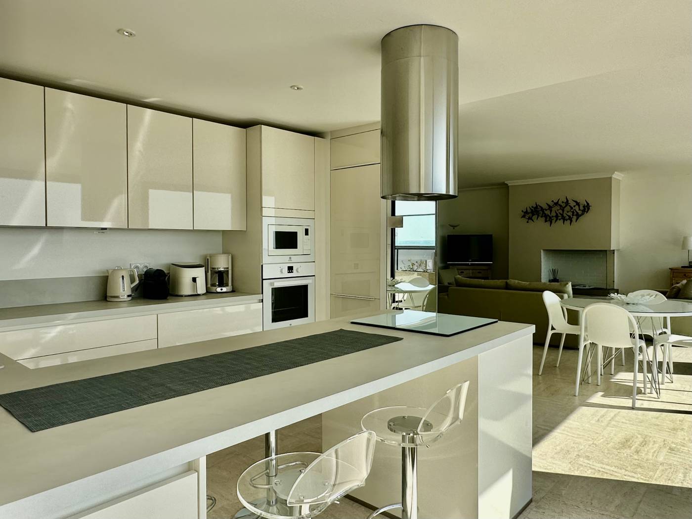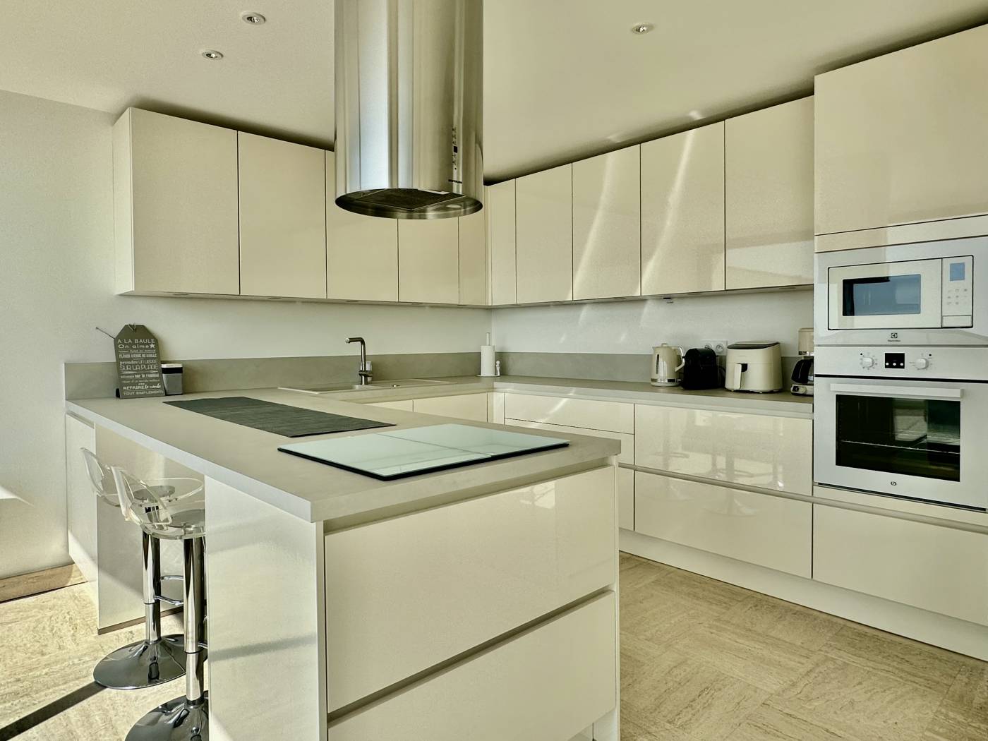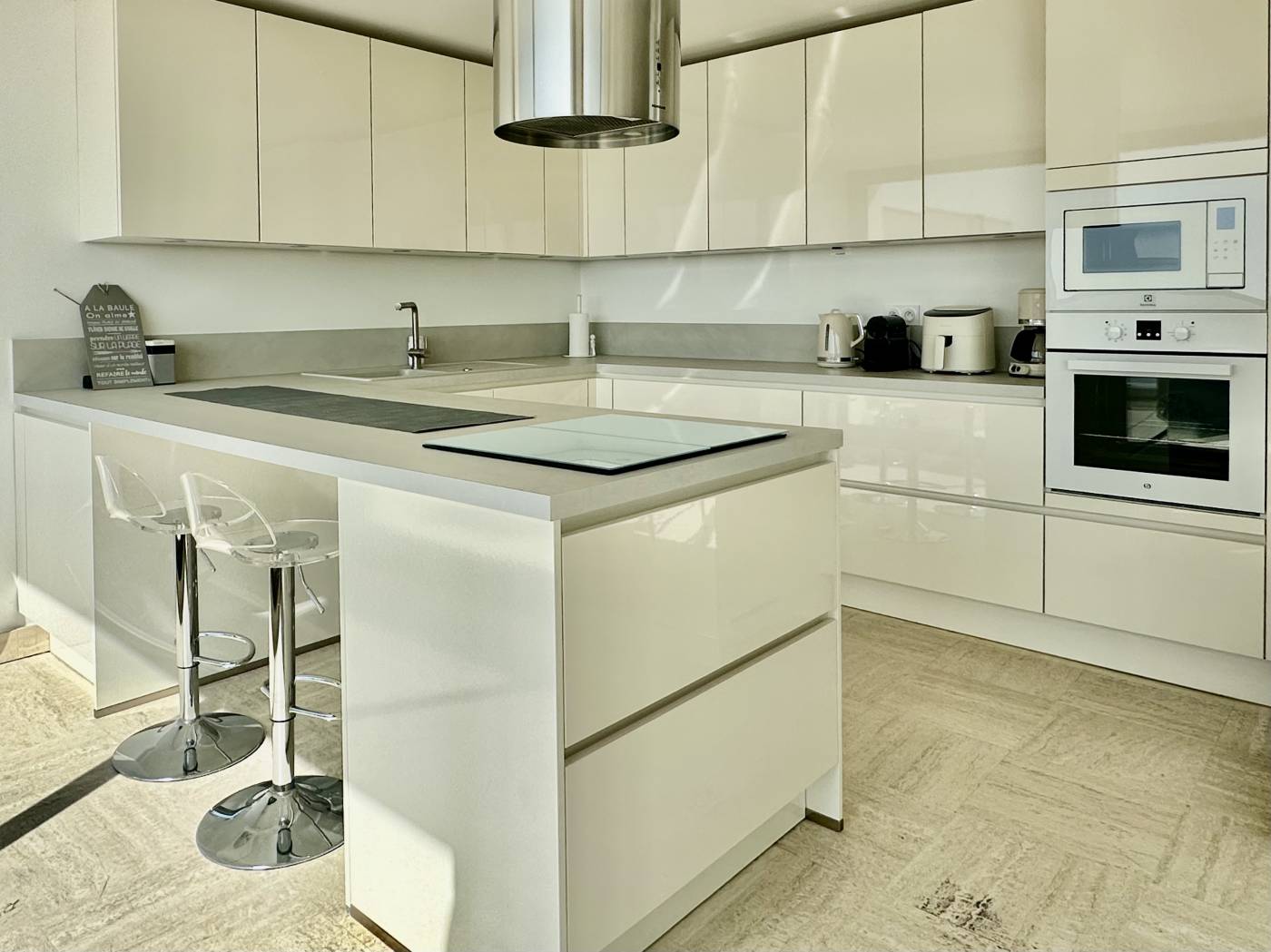 La cuisine ouverte est entièrement aménagée avec des équipements modernes : four, lave-vaisselle, plaque vitro, hotte, micro-ondes, réfrigérateur-congélateur, cafetière Nespresso, airfryer.
