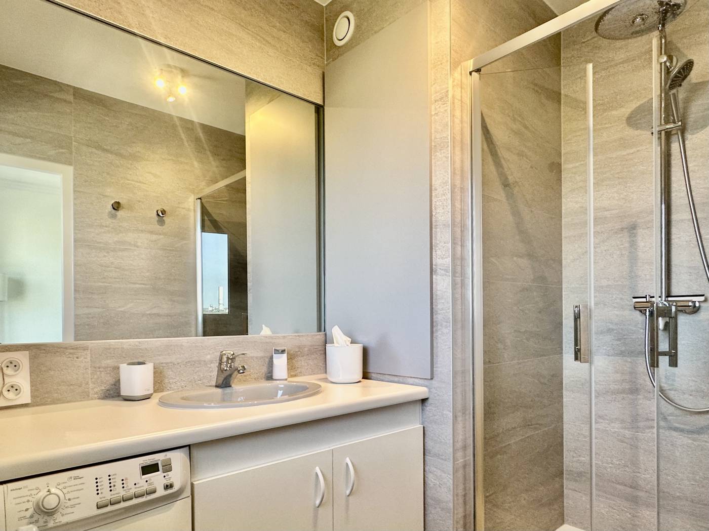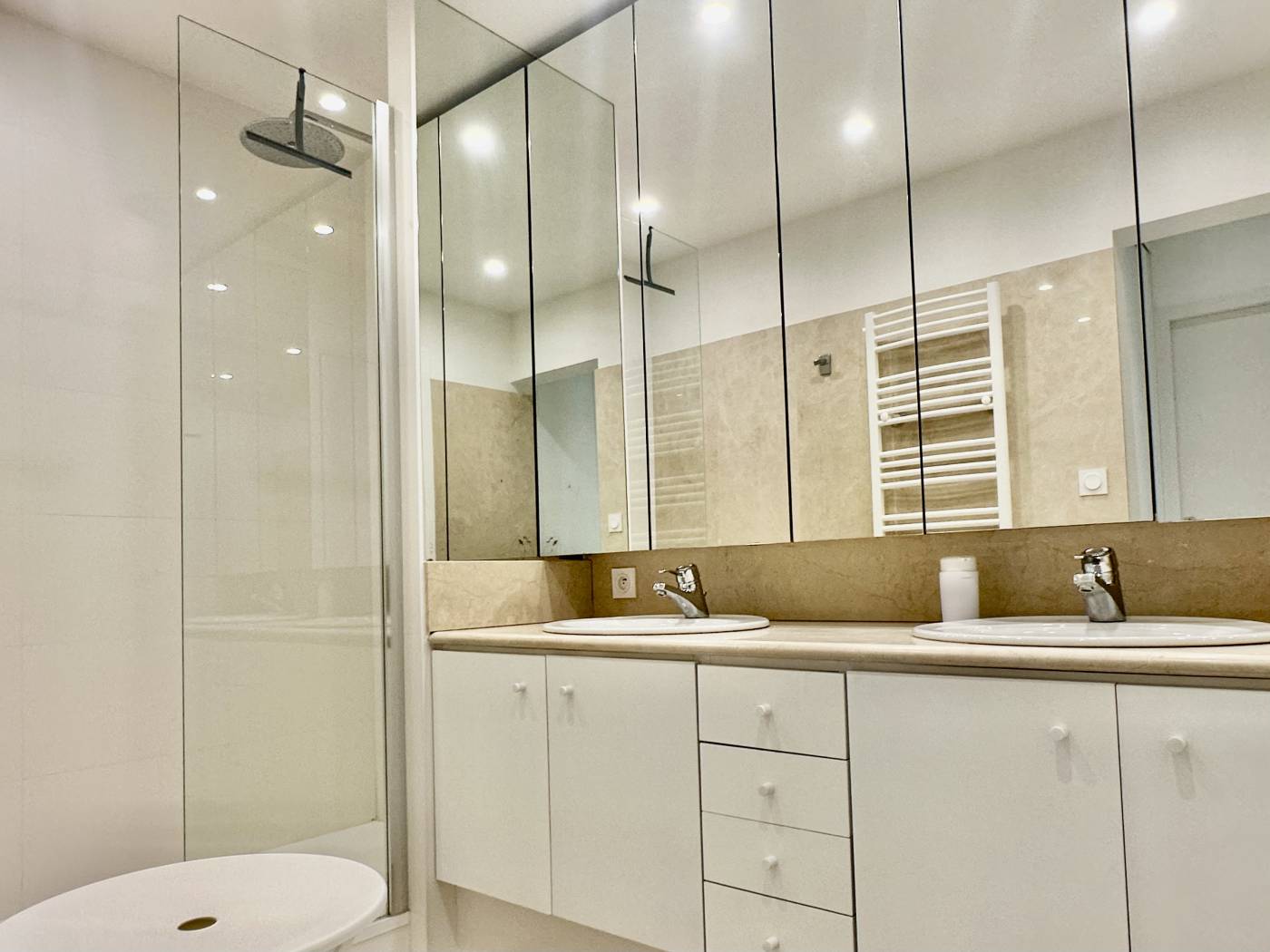 • Chambre 2 : un lit 160x200 cm, TV, rangements et accès au balcon + salle de douche avec double vasque et placard.