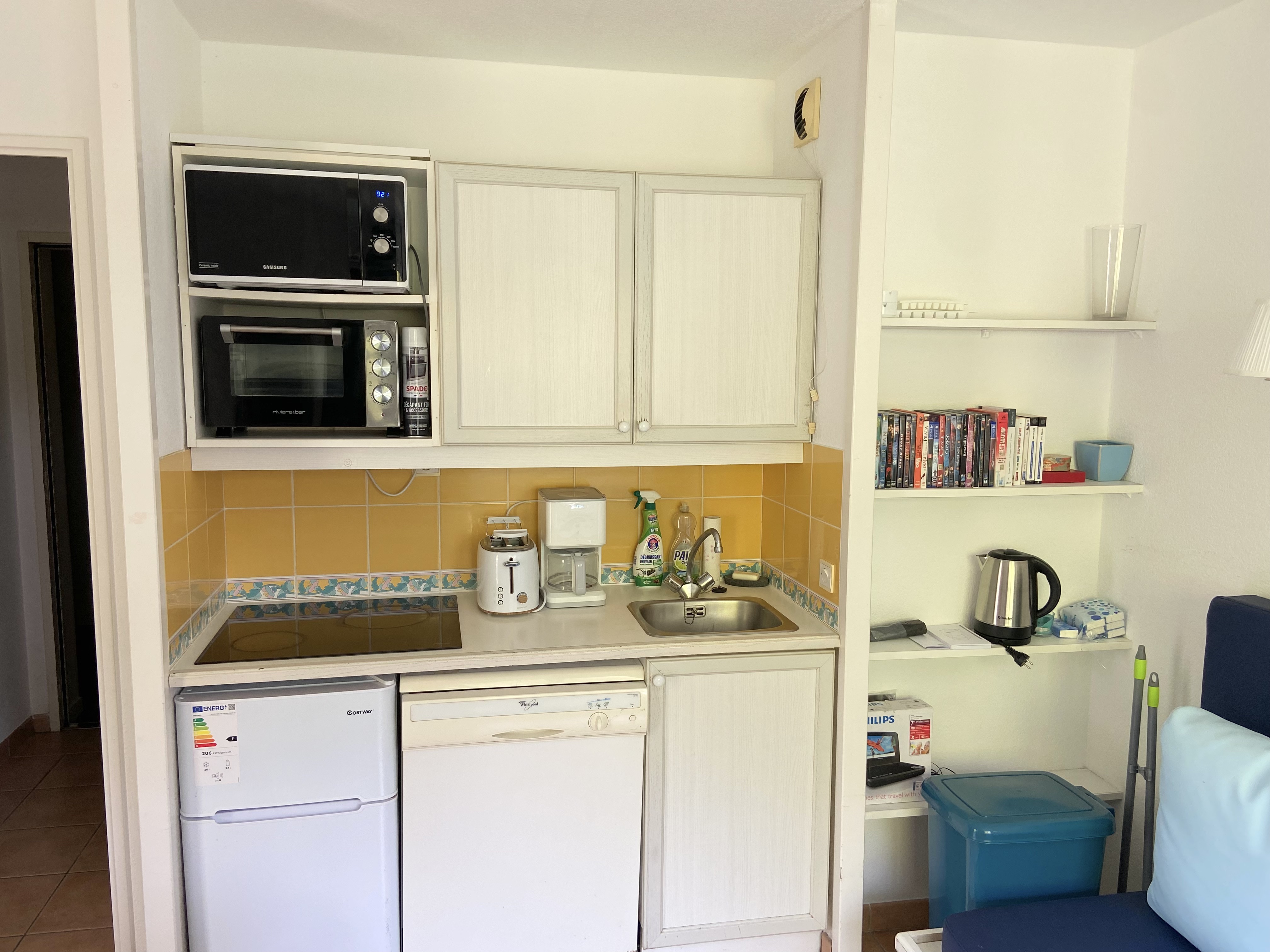 -d’un séjour lumineux avec TV écran plat et cuisine ouverte équipée (plaque induction, four, micro-ondes, réfrigérateur-congélateur),
