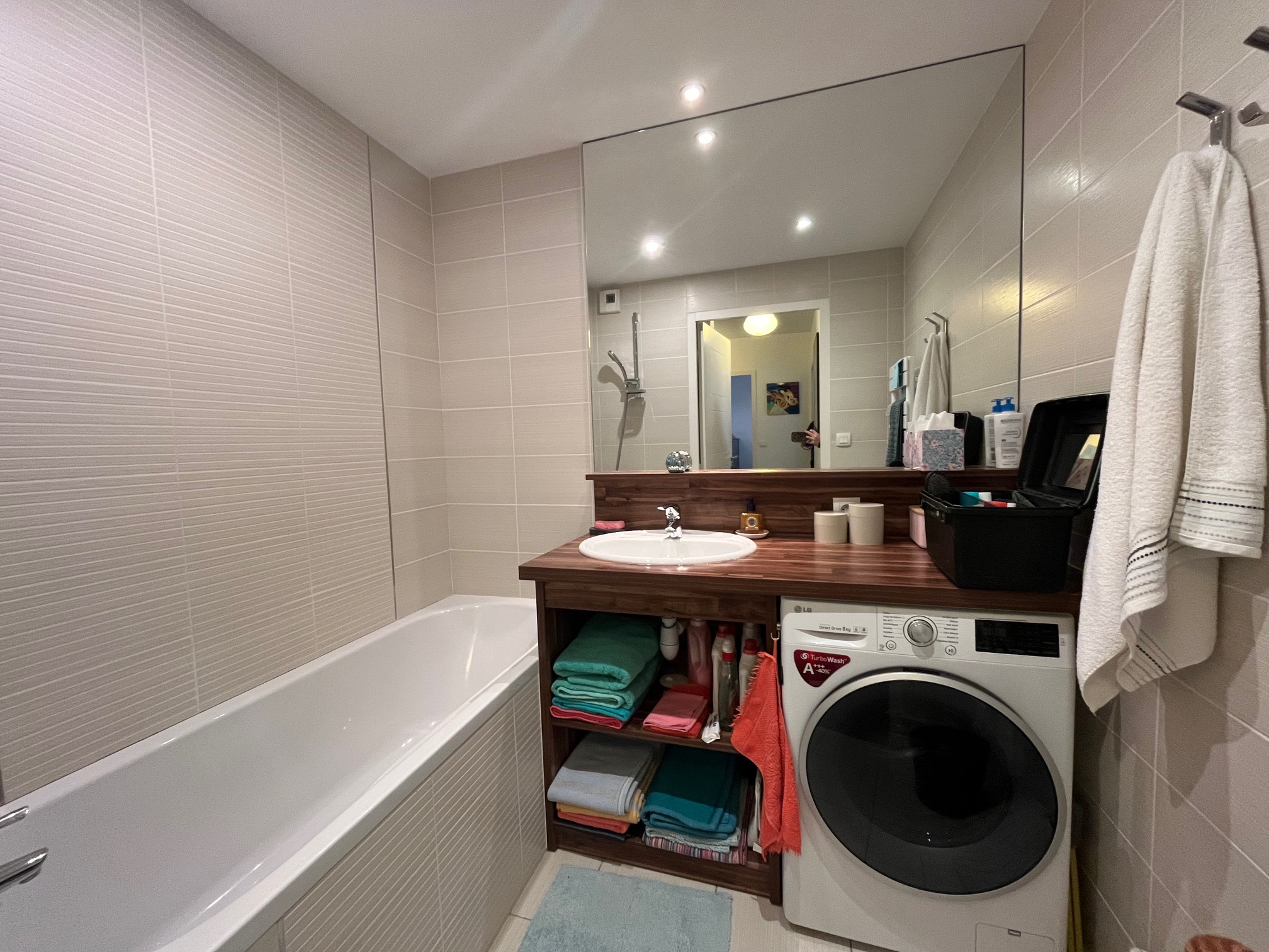 Dès l’entrée, un grand placard permet de ranger facilement vos affaires. Le couloir dessert des WC indépendants, une salle de bains équipée d’une baignoire, d’un meuble vasque, d’un lave-linge et d’un sèche-serviette.