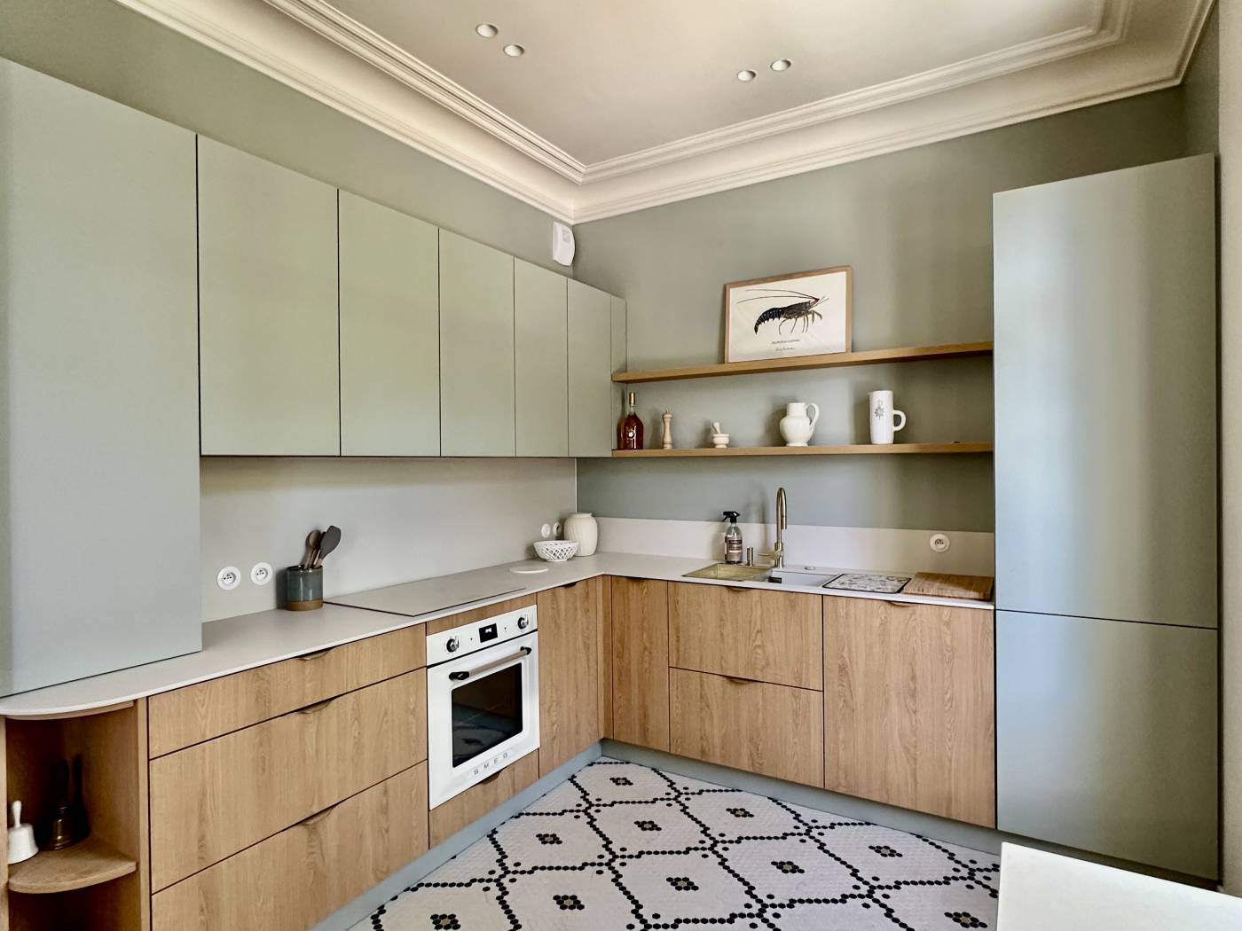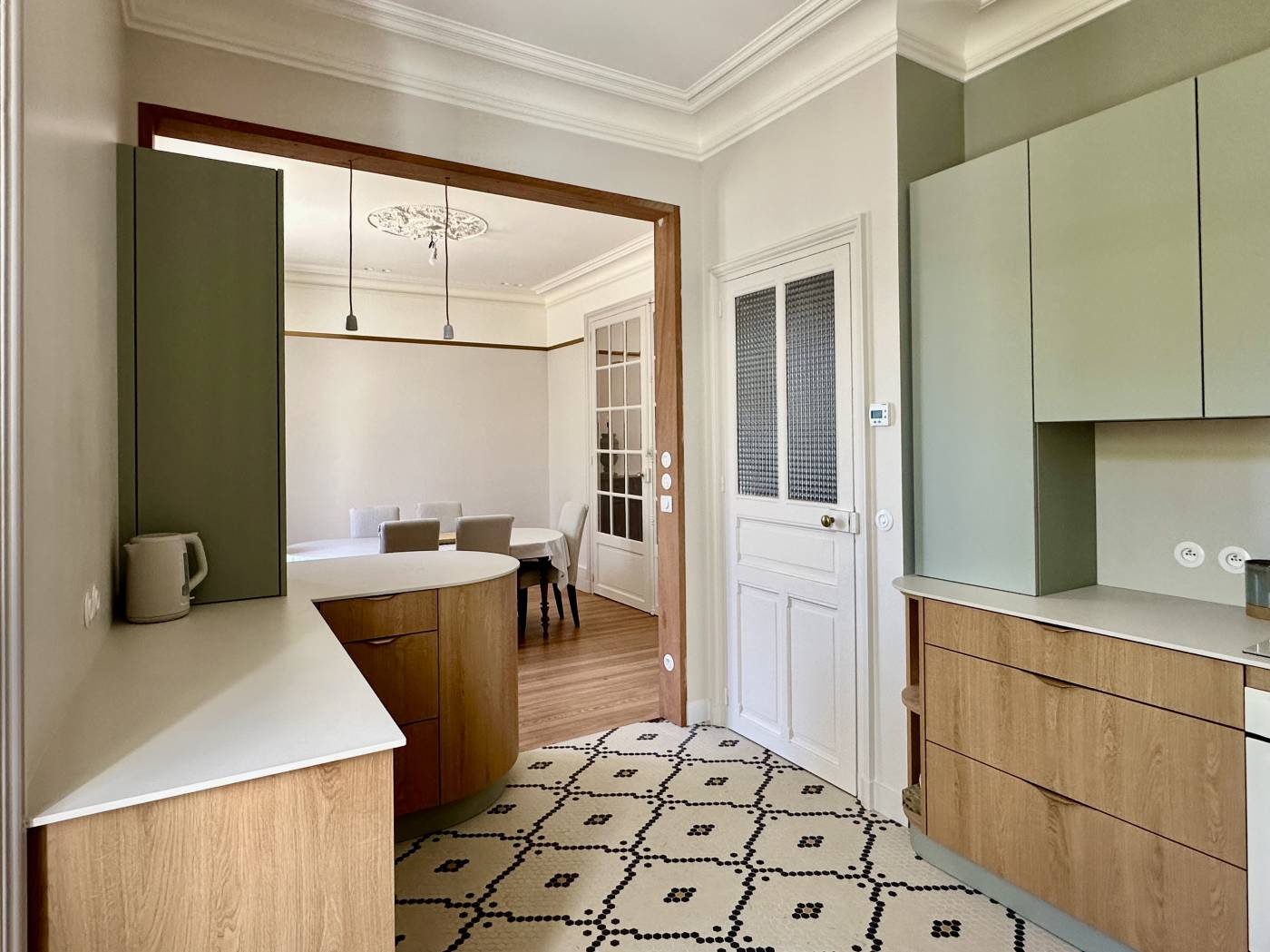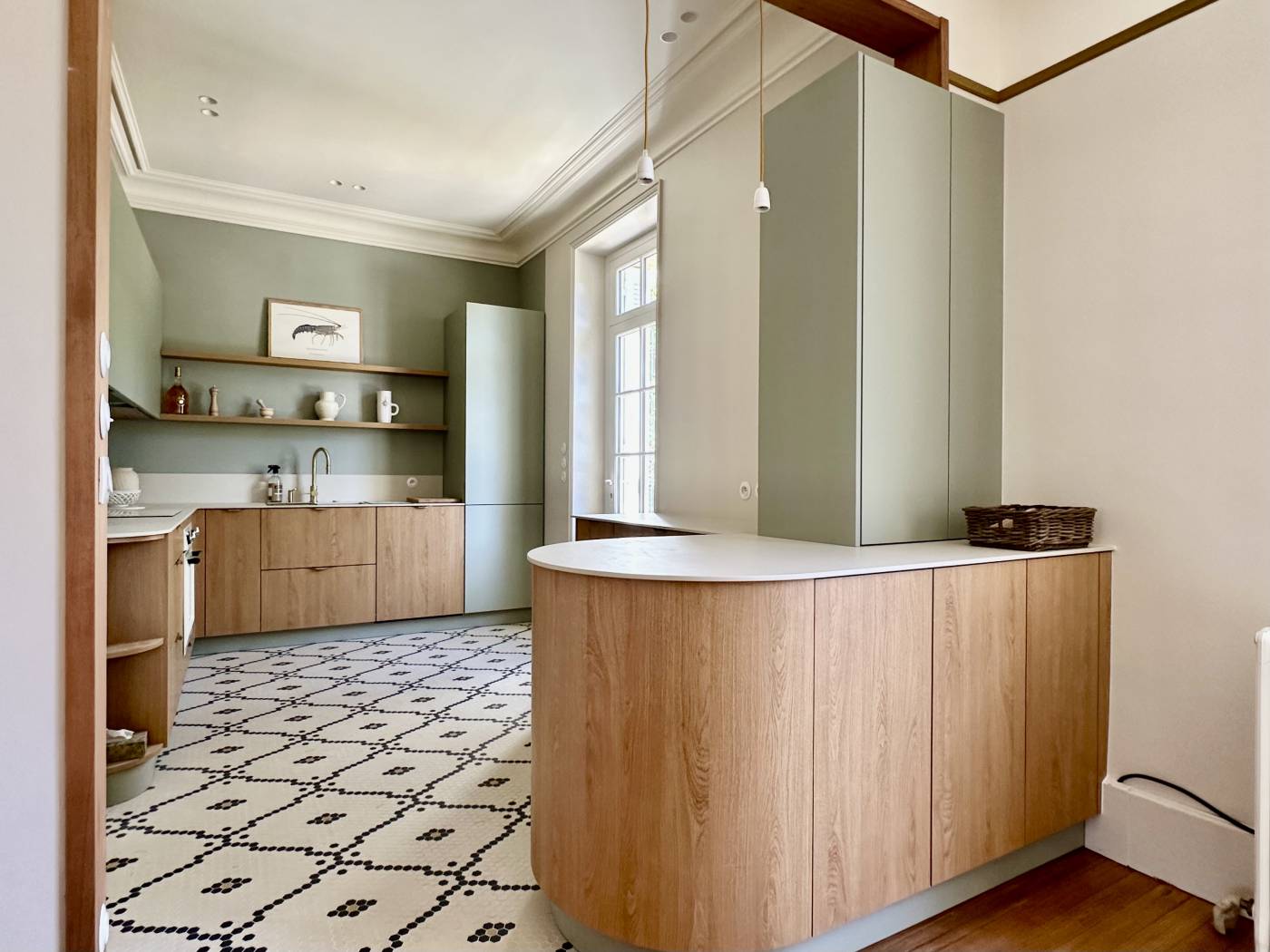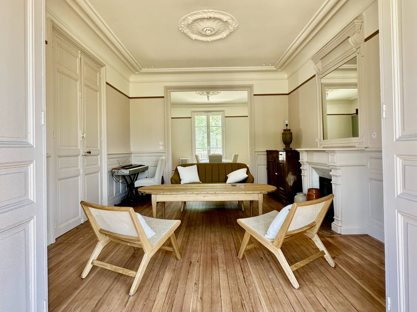 Vaste pièce de vie lumineuse avec salon (pas de télévision mais connexion internet), séjour et cuisine américaine entièrement équipée (hotte, four, plaque induction, réfrigérateur-congélateur, lave-vaisselle). WC invités.