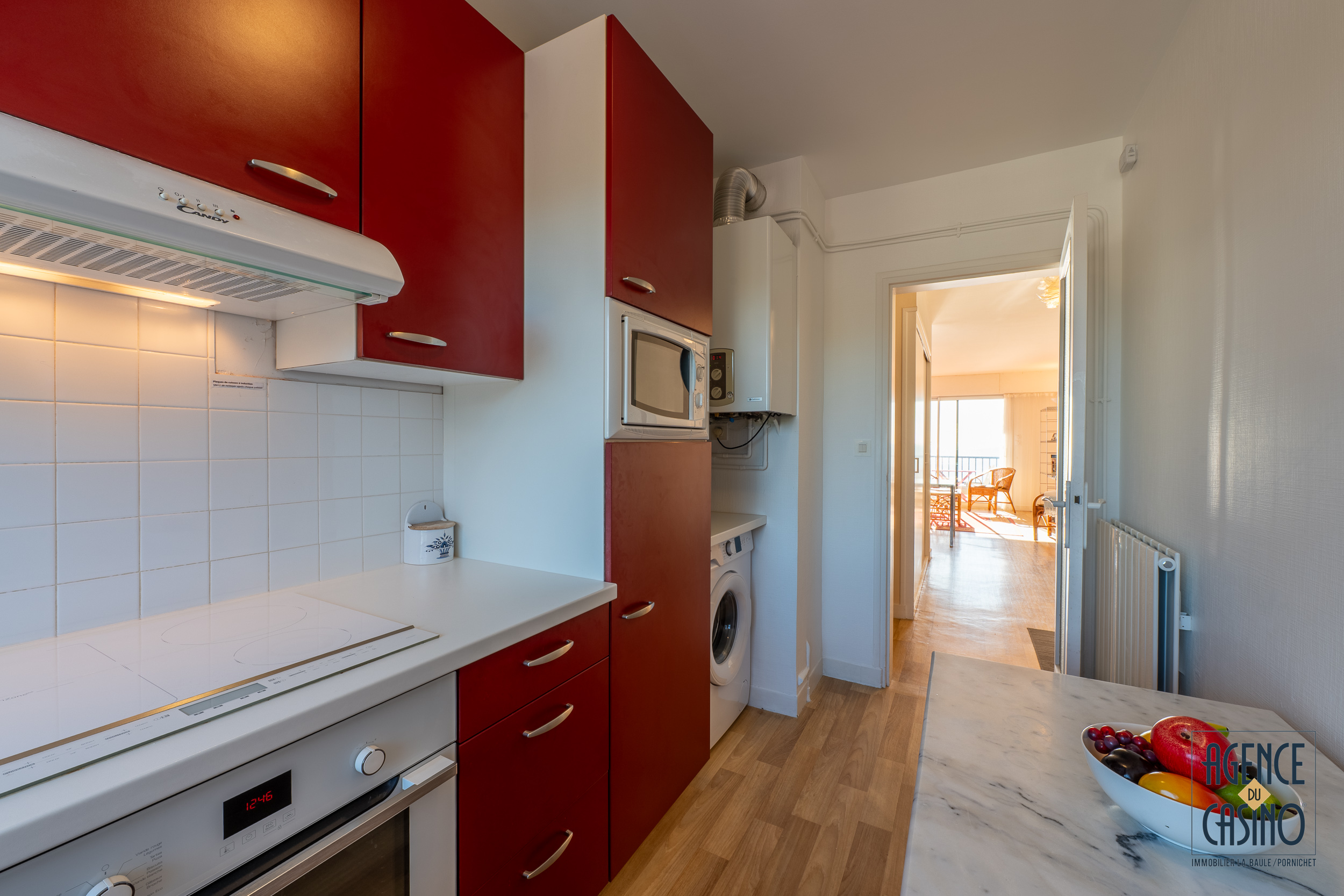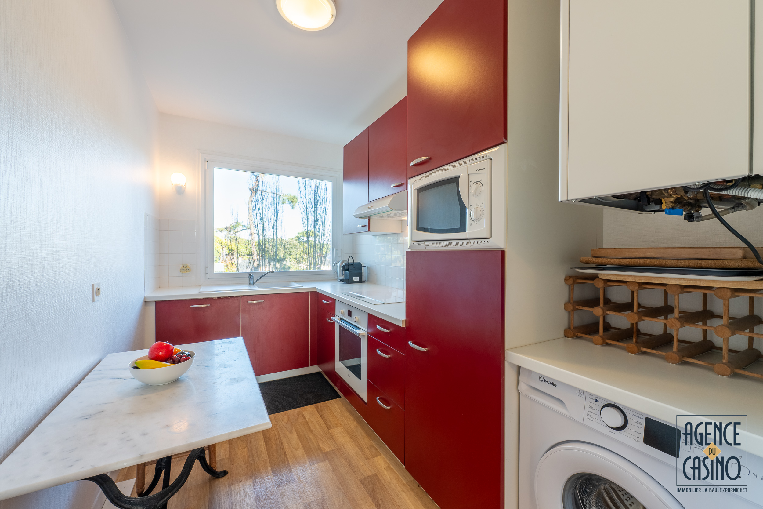 La cuisine indépendante, entièrement aménagée et équipée (plaques induction, four, réfrigérateur, lave-vaisselle, lave-linge, micro-ondes, machine expresso), permet un séjour en toute autonomie.