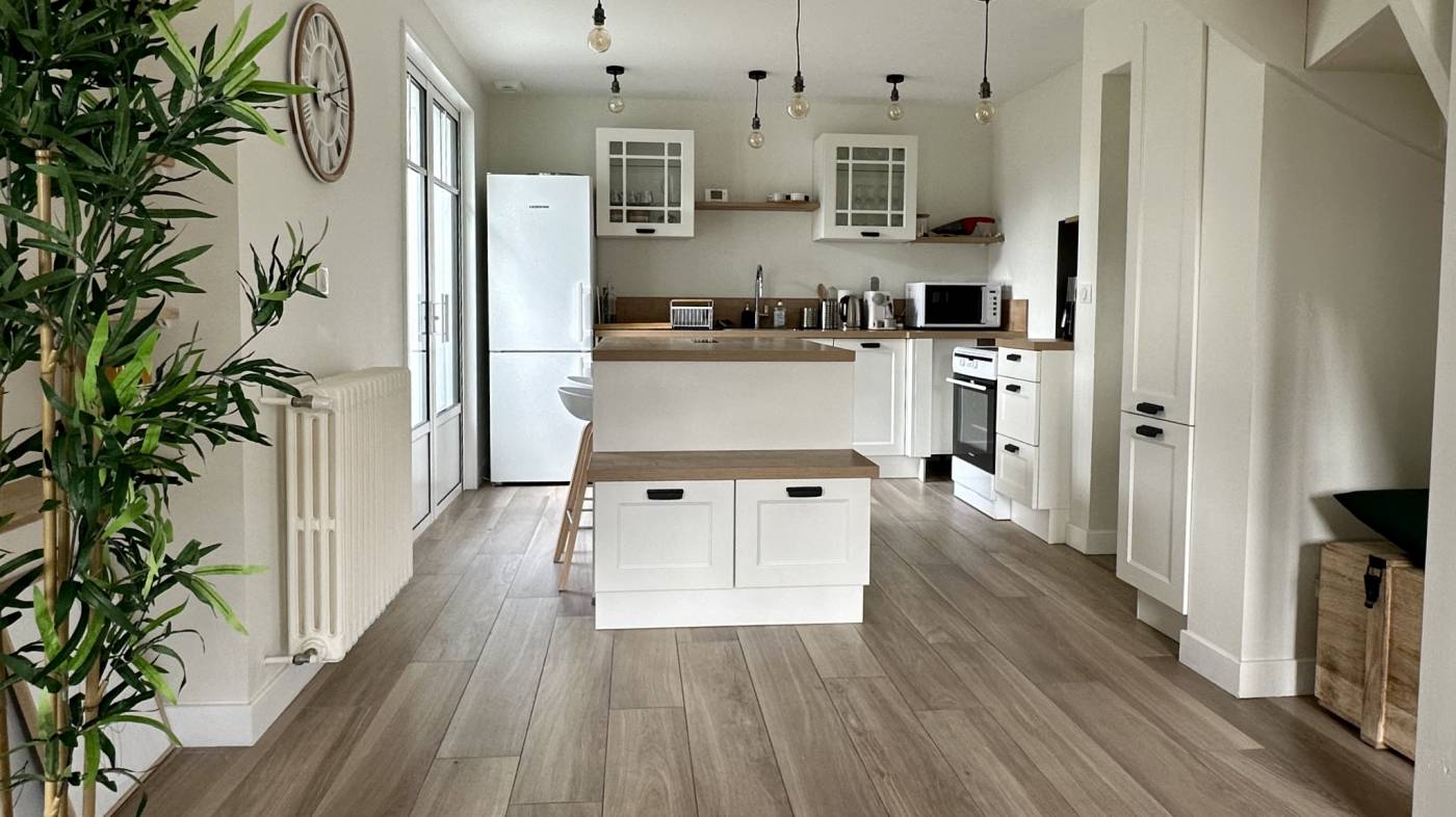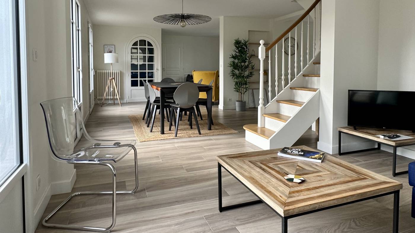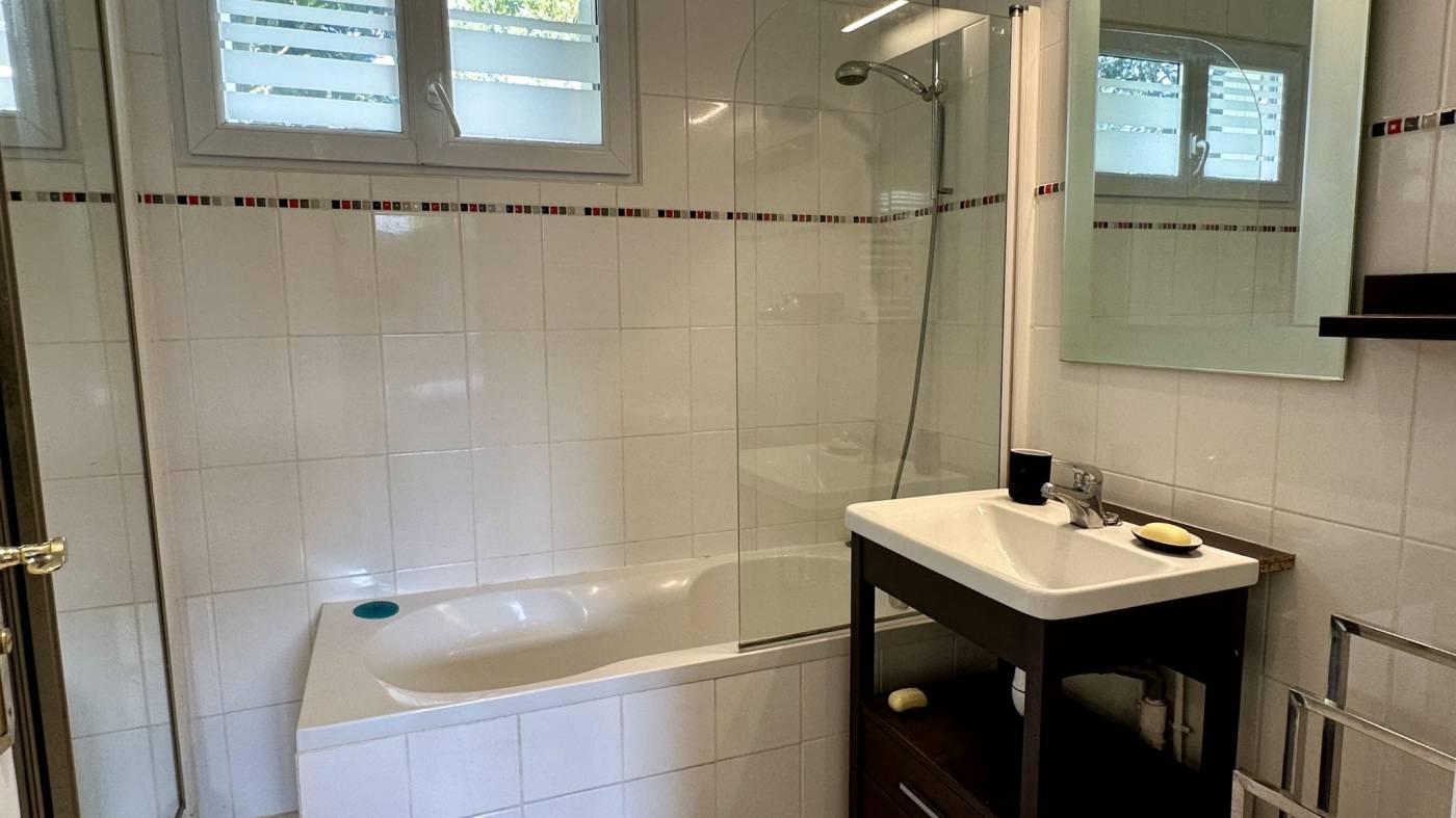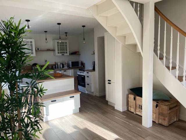 Elle comprend une entrée, une belle pièce de vie composée de 3 espaces, salon, cuisine avec espace repas (réfrigérateur/congélateur, lave-vaisselle, micro-ondes, cuisinière avec four et plaque, Nespresso, table avec rallonge) + accès garage avec lave-linge et sèche-linge, Salon tv avec canapé lit.