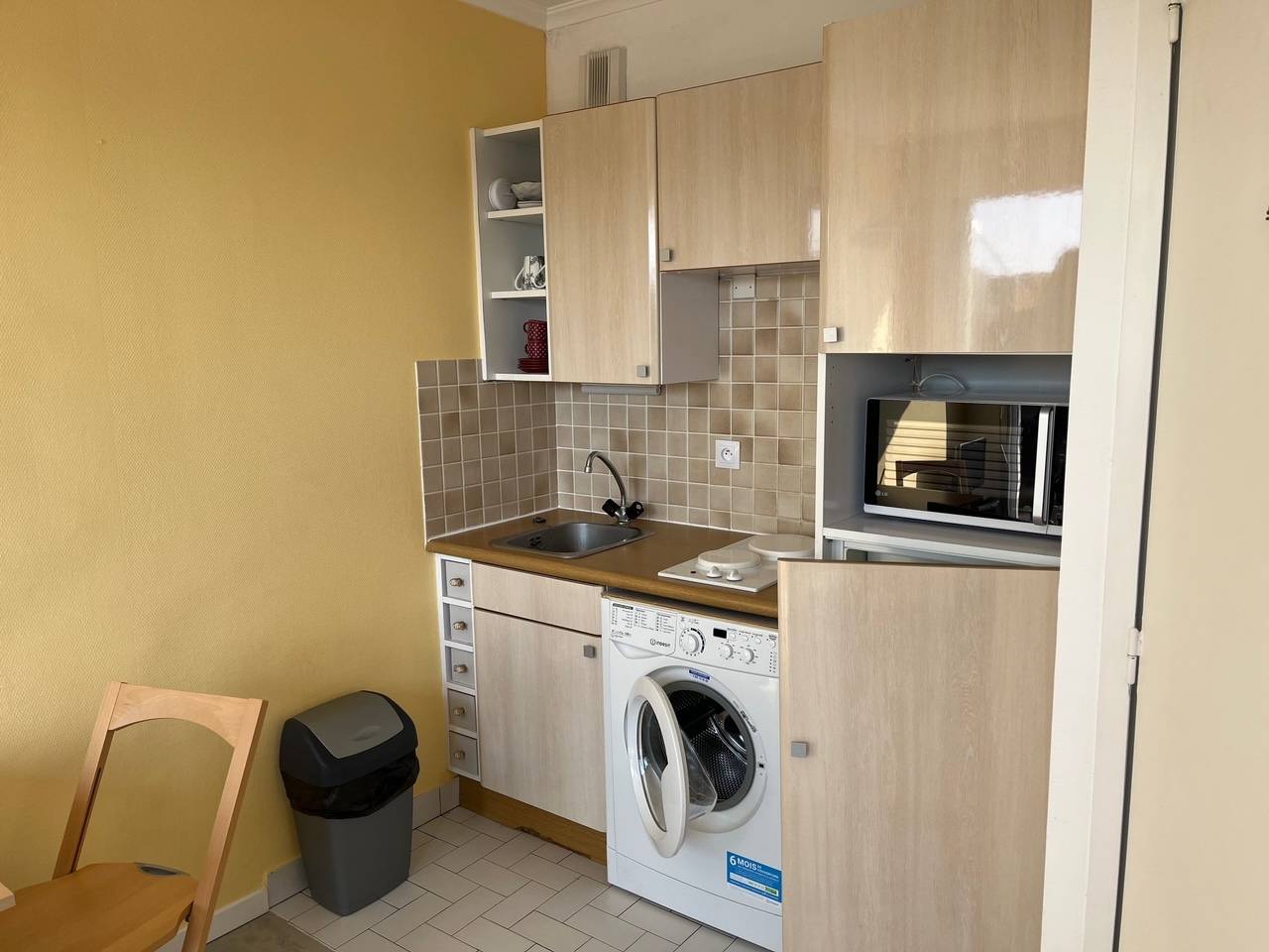 Entrée avec coin cabine (lit 90/190 + placard/penderie) - Pièce de vie (canapé lit 140/190) ouverte sur terrasse avec mobilier - Espace cuisine avec lave-linge, réfrigérateur/freezer, micro-ondes et plaque électrique de cuisson - Salle de bain - WC. Parking privé extérieur.