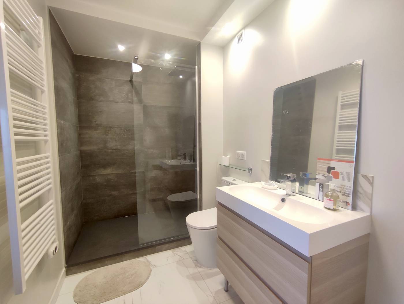 La chambre principale élégante et confortable dispose d'un lit en 160/200, d'un placard, d'un bureau et d'un accès direct à la terrasse. La salle d'eau moderne et fonctionnelle est équipée d'une grande douche, d'un meuble vasque, de toilettes et d'un sèche-serviettes. Deux accès sont possibles, soit par la chambre, soit par le dégagement.