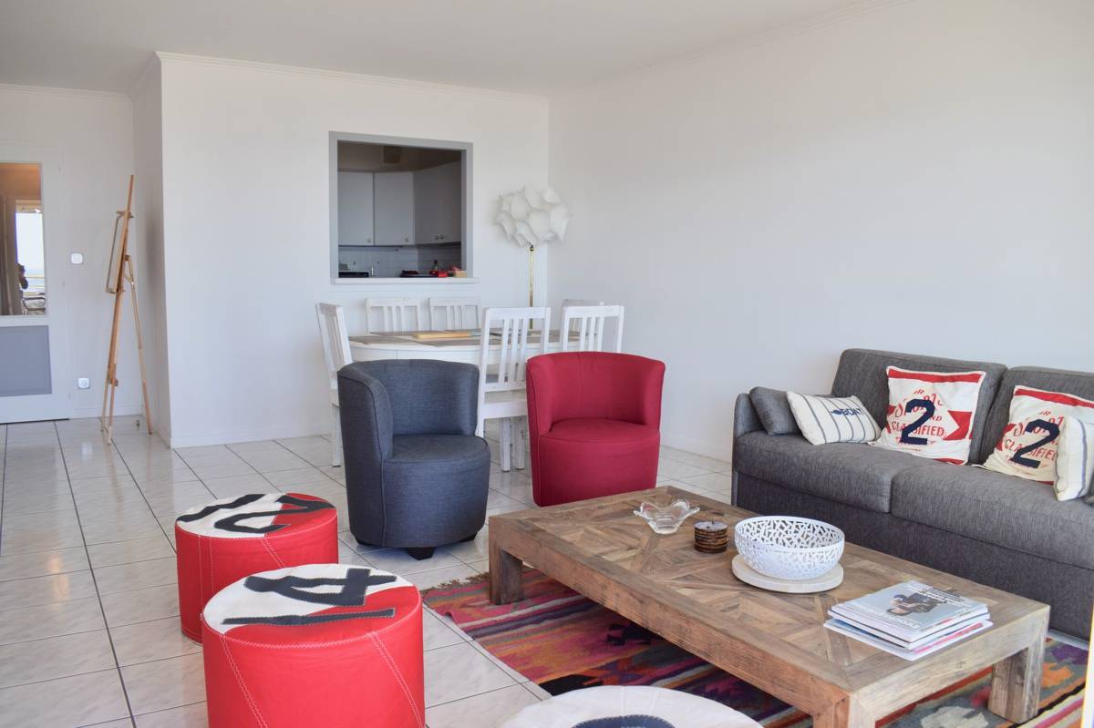 Beaux volumes pour cet appartement situé au 1er étage d'une résidence de standing de la plage Benoit comprenant : Entrée - Belle pièce de vie avec canapé lit
