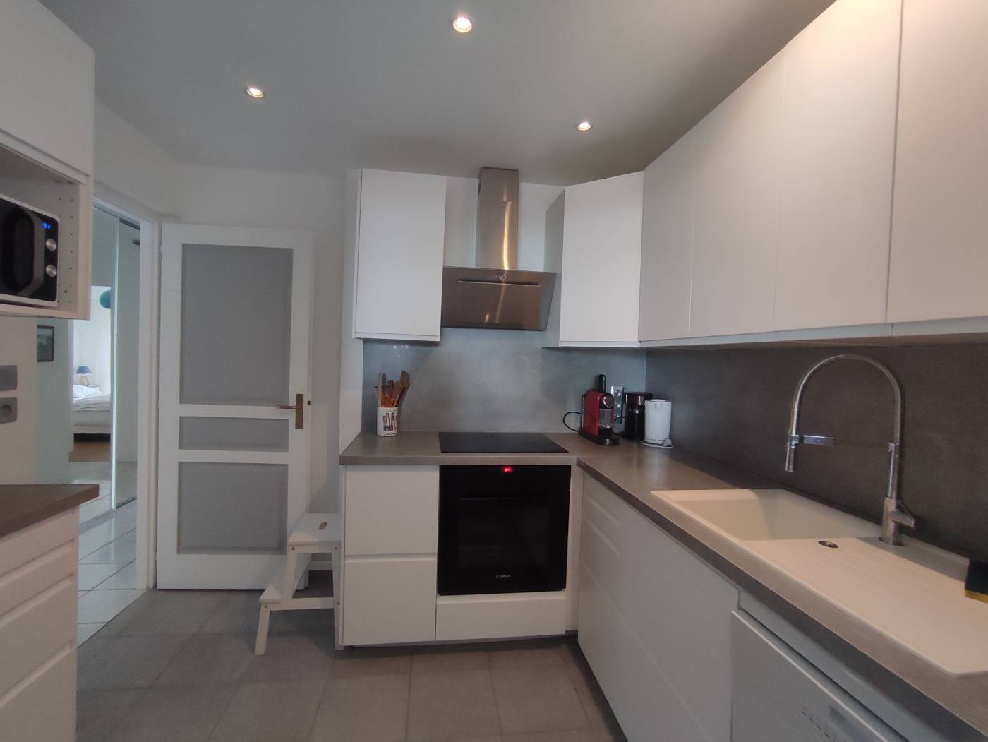 en 140/190 et TV écran plat (chaines Canal + incluses) ouverte sur grande terrasse offrant une superbe vue sur la mer avec stores bannes et mobilier - Cuisine semi ouverte aménagée et équipée (plaque vitro - Lave-vaisselle - Micro-ondes - Four - Hotte - Réfrigérateur/cong. - Nespresso) - Dégagement avec placards - WC ind. - SDE avec douche italienne - Chambre n°1 avec 2 lits 90/200 + placard/penderie - Chambre n°2 ouverte sur balcon arrière avec 2 lits 90/200 - SDB avec WC - Chambre n°3 ouverte sur balcon arrière avec lit 160/200 + tv écran plat + placard. Garage double en sous-sol. CONNEXION WIFI FIBRE. Numéro d'enregistrement : 4405500024307