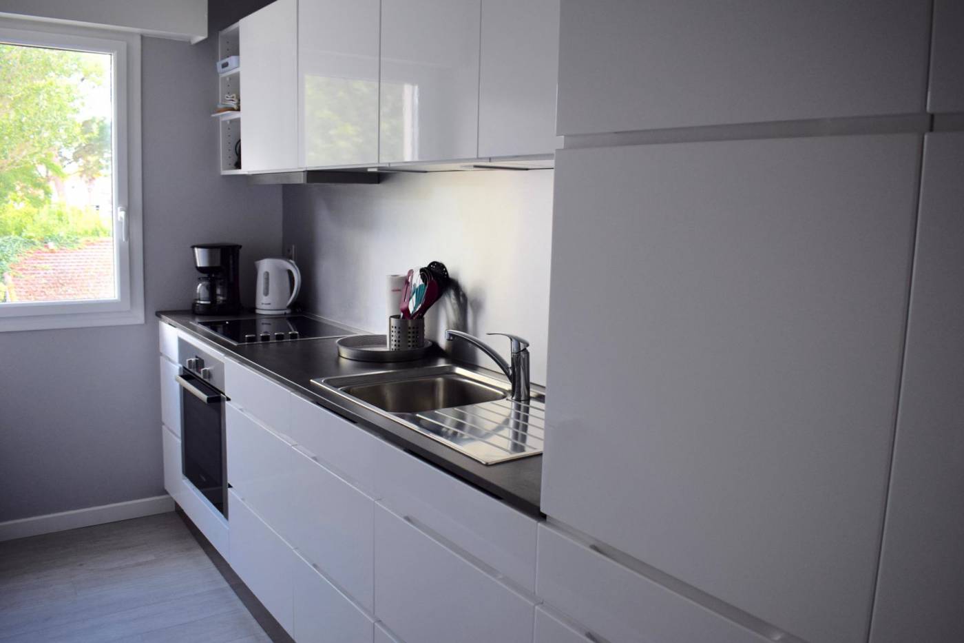 Bel appartement de 3 pièces traversant au 1er étage d'une résidence avec ascenseur offrant : Entrée avec placard - Pièce de vie avec balcon (TV écran plat) - Cuisine indépendante Aménagée et équipée (Four - Lave Vaisselle - Lave Linge - Réfrigérateur/Congélateur - Plaque Vitrocéramique - Hotte - Cafetière - Bouilloire - Grille Pain) - Chambre 1 avec lit en 140/190 + commode donnant sur l'arrière de la résidence - Salle d'eau avec douche d'angle - Chambre 2 avec balcon et lit en 140/190 + armoire donnant sur l'arrière de la résidence - WC indépendant - Parking privé. Internet Wifi. N°MAIRIE : 44055000866AF