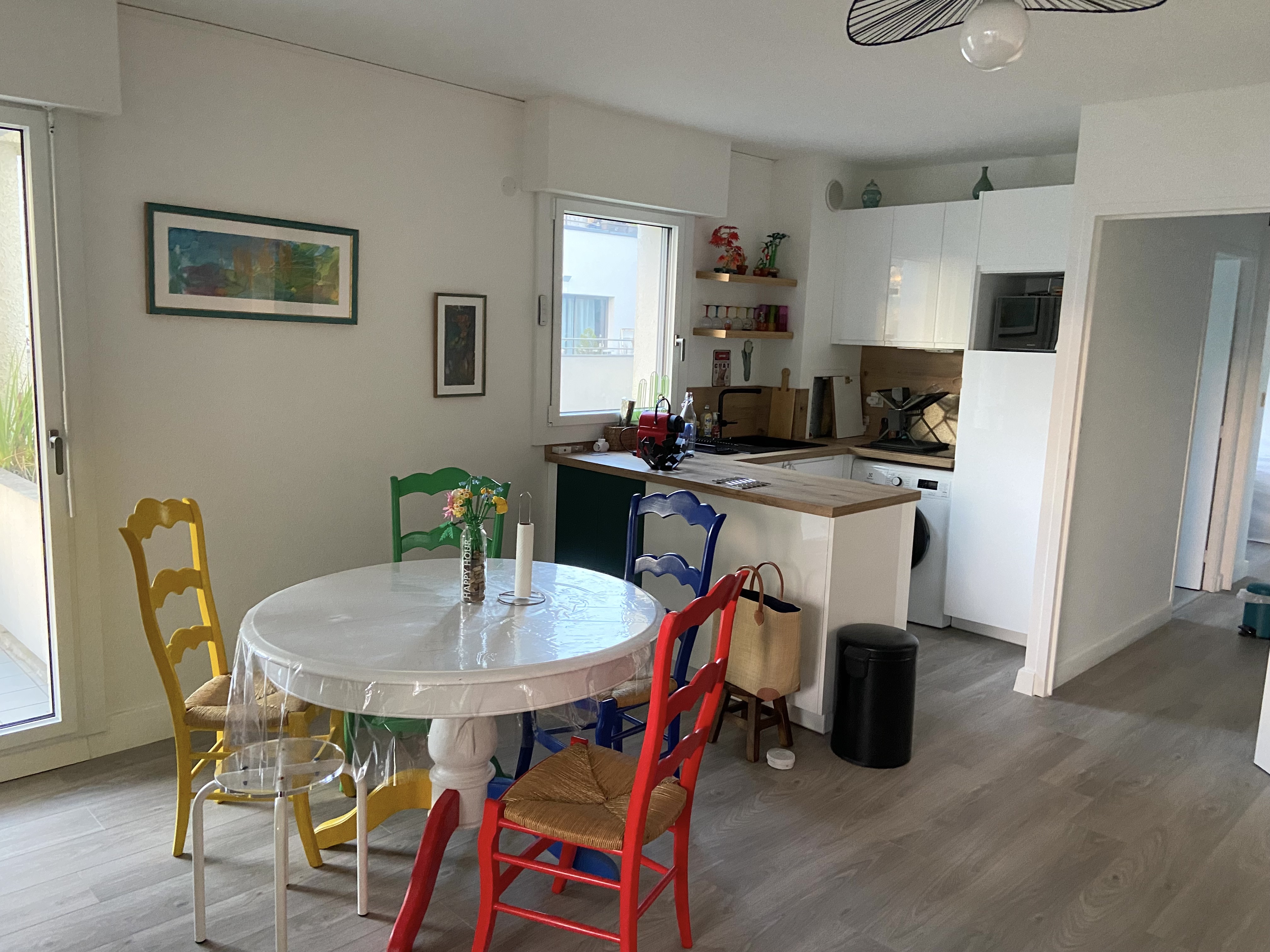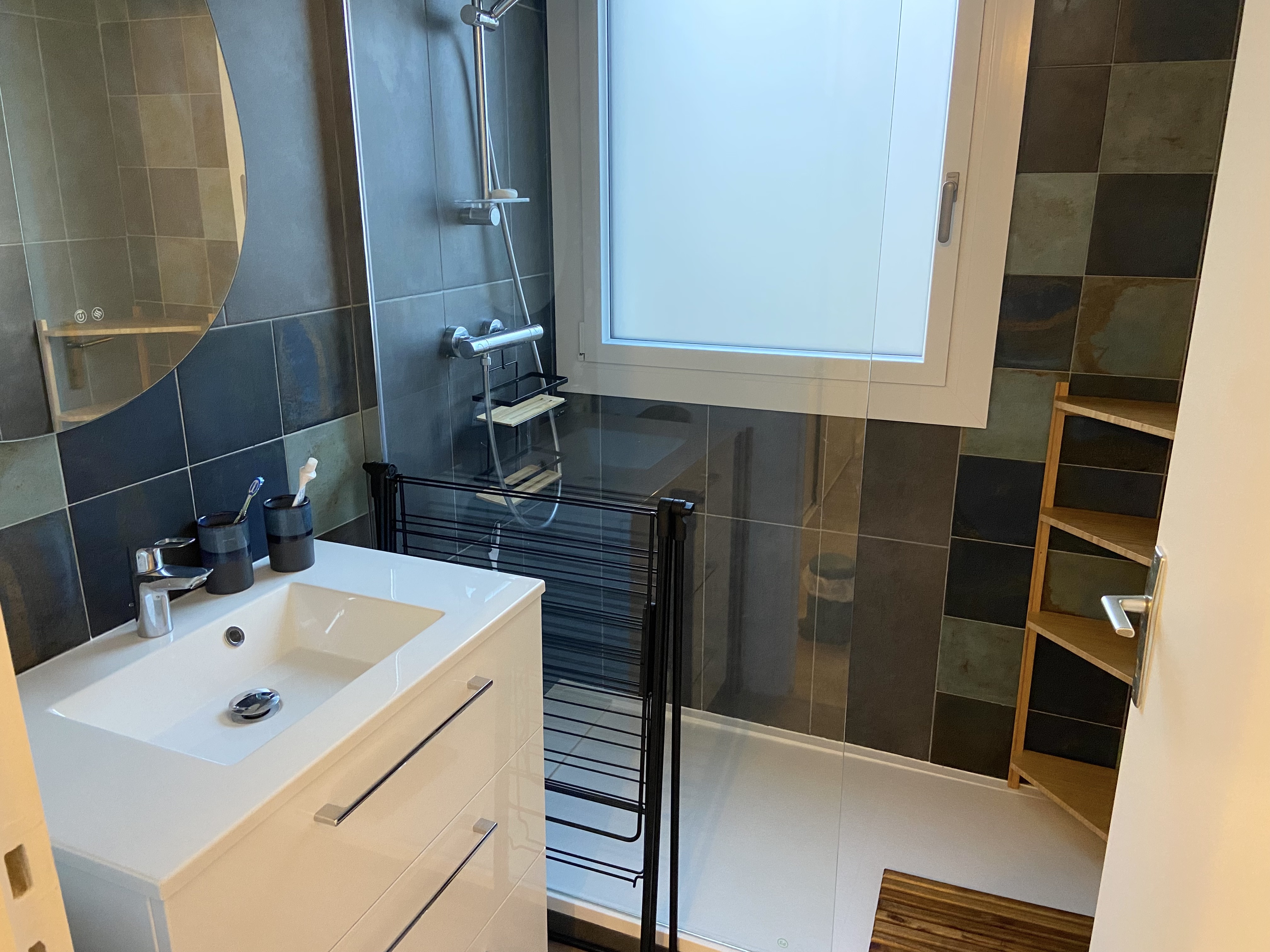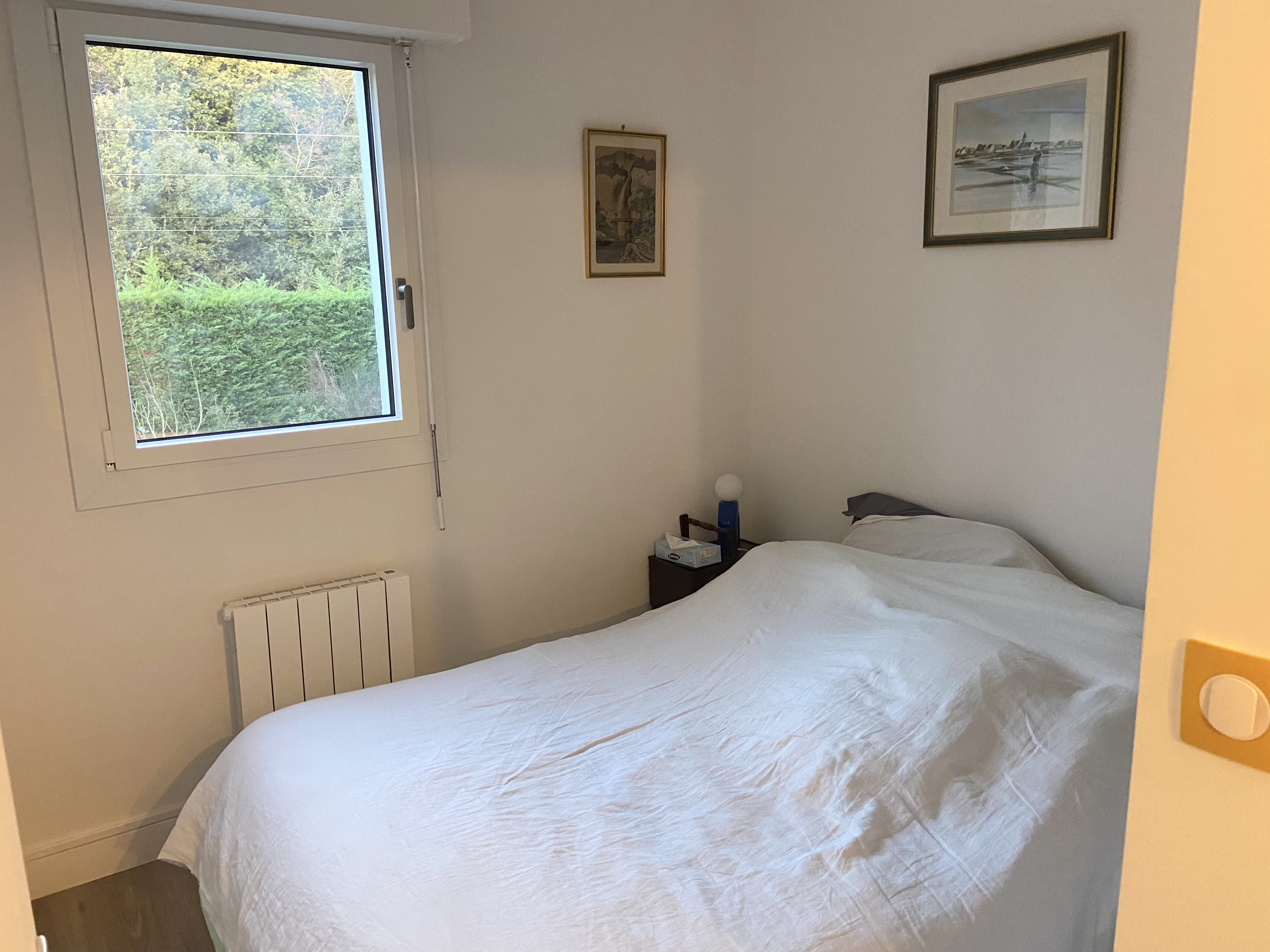 L’appartement propose deux chambres : une première chambre équipée d’un lit double 140x190, et une seconde chambre avec deux lits 80x190 pouvant être réunis en un lit double 160. La salle d’eau comprend une douche, un sèche-serviettes avec WC séparés .