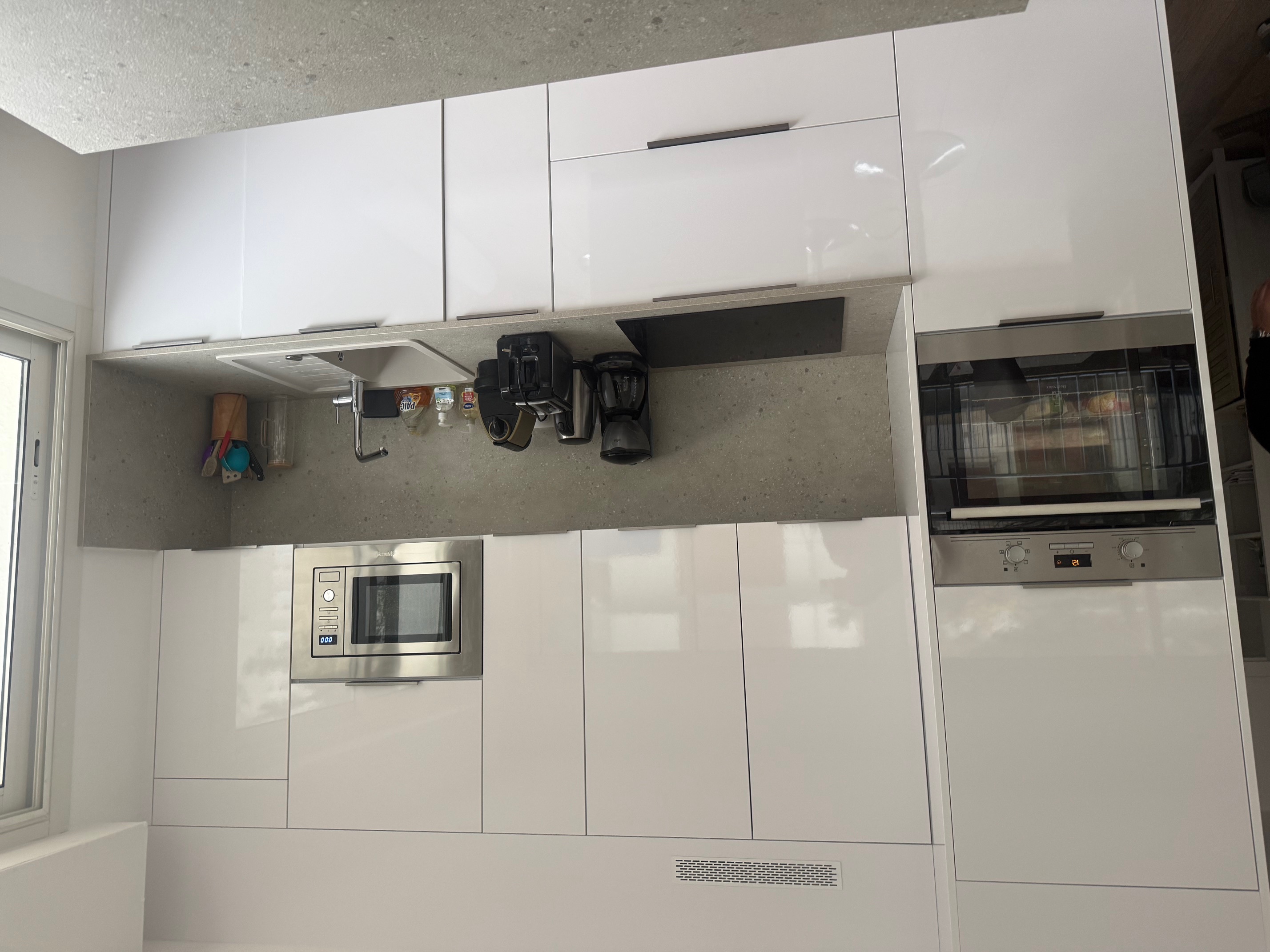 La cuisine ouverte, moderne et fonctionnelle, est entièrement aménagée et équipée (plaques vitrocéramiques, lave-vaisselle, four, micro-ondes, réfrigérateur, cafetière filtre et Nespresso, grille-pain).