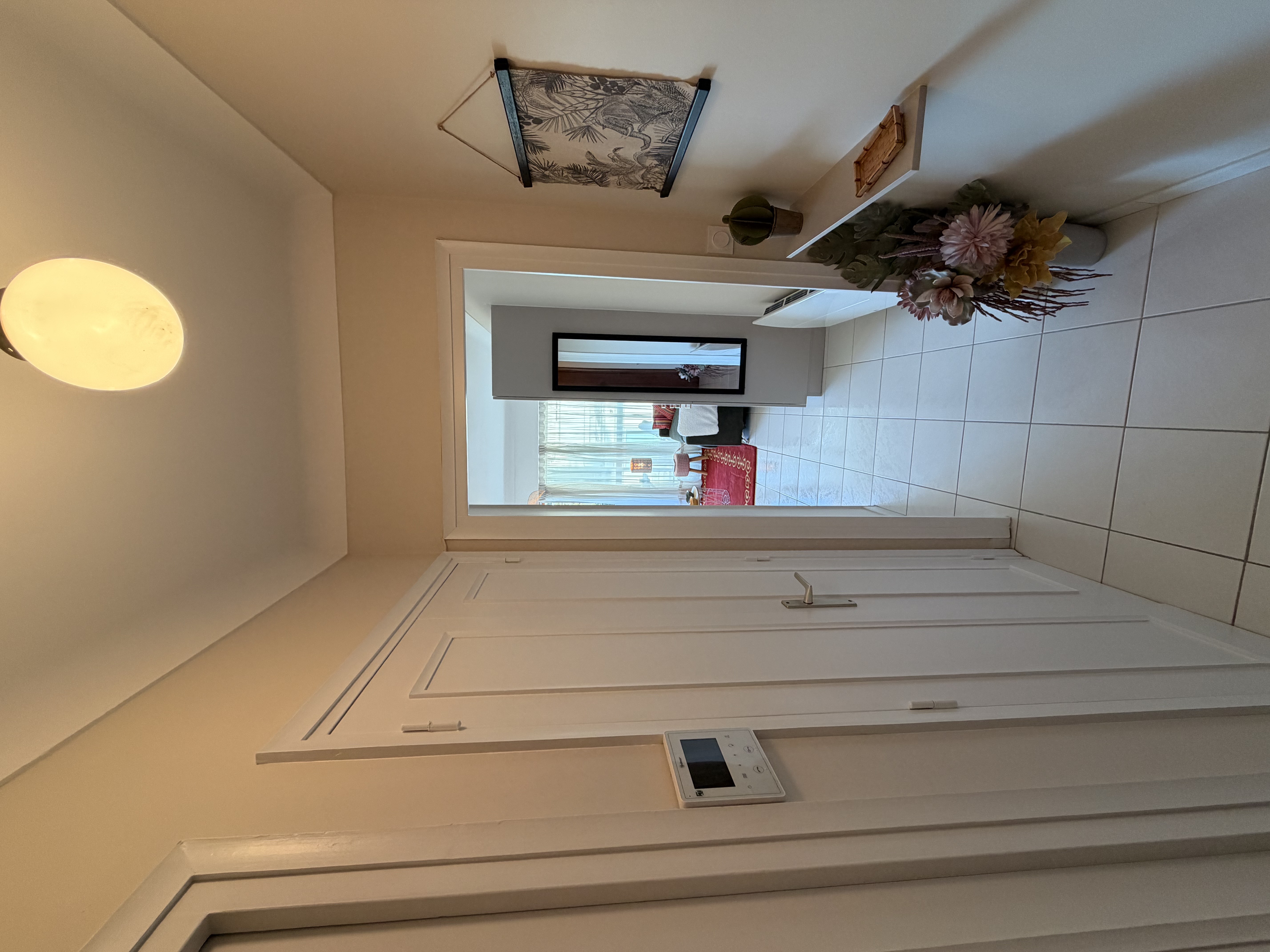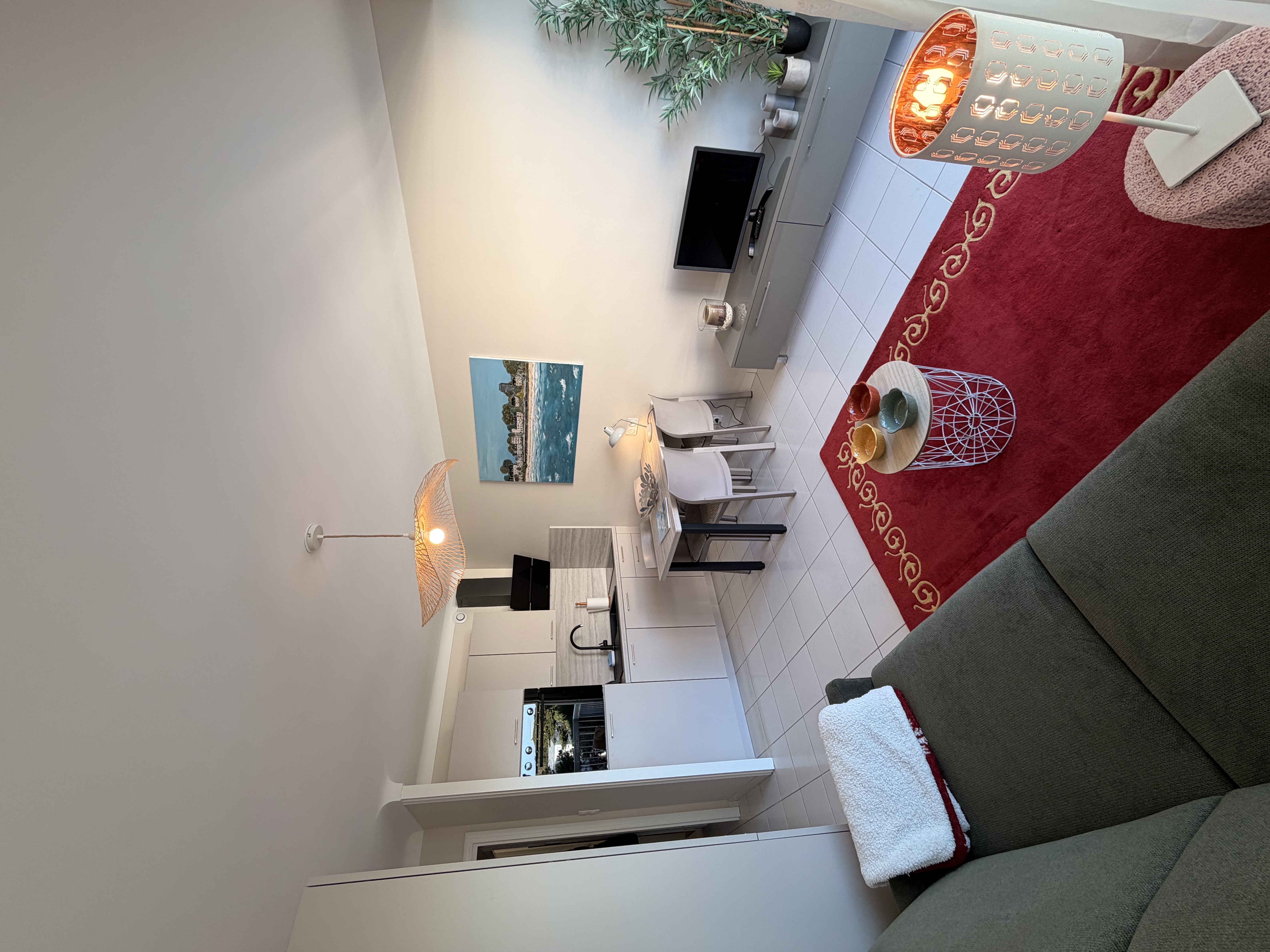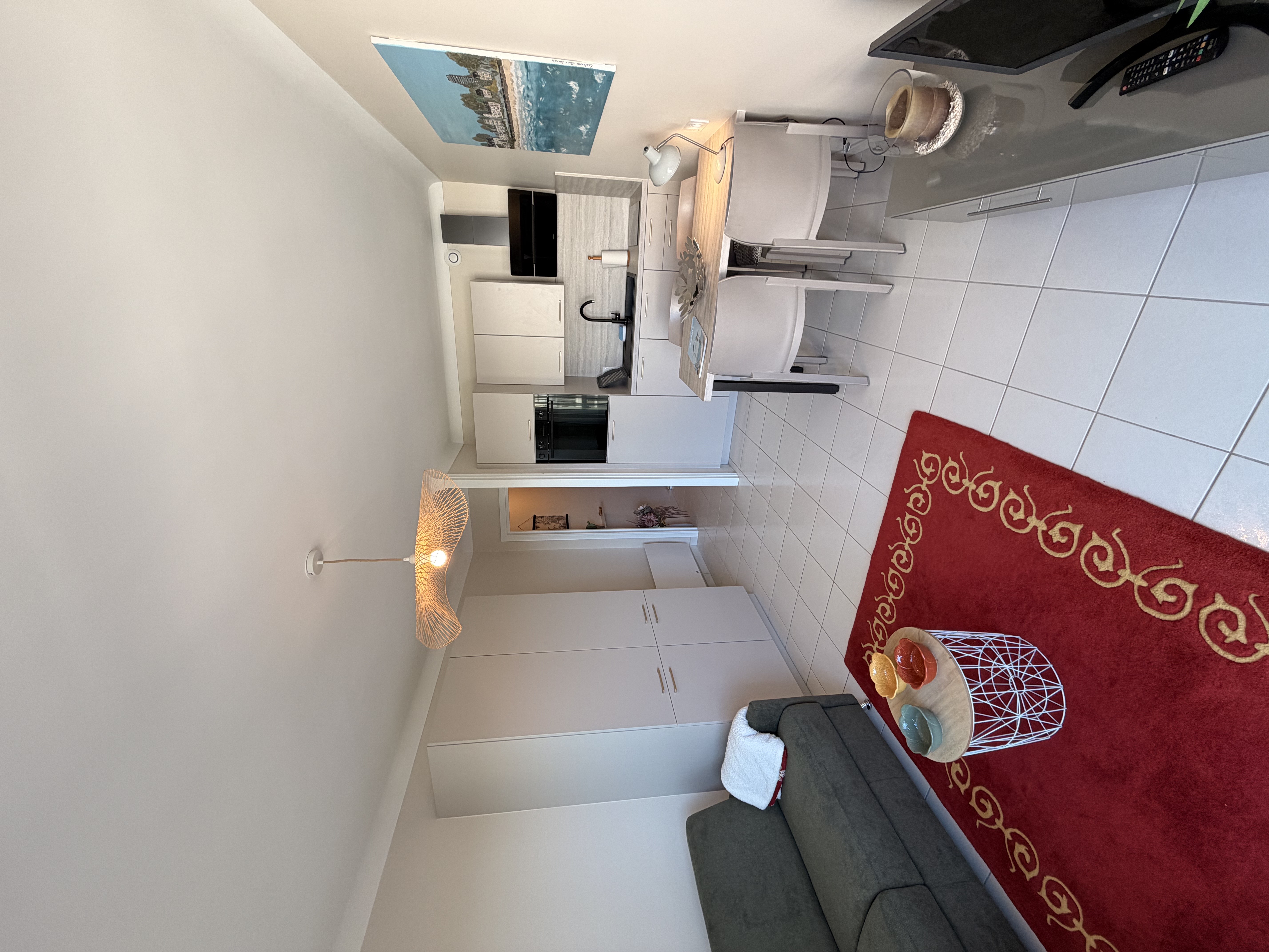 L’appartement s’ouvre sur une entrée avec placard, offrant des rangements pratiques. La pièce de vie, claire et bien agencée, comprend un canapé-lit (140×190), une télévision et une cuisine ouverte entièrement équipée (réfrigérateur avec freezer, deux plaques induction, four, lave-vaisselle, cafetière Tassimo, bouilloire, grille-pain).