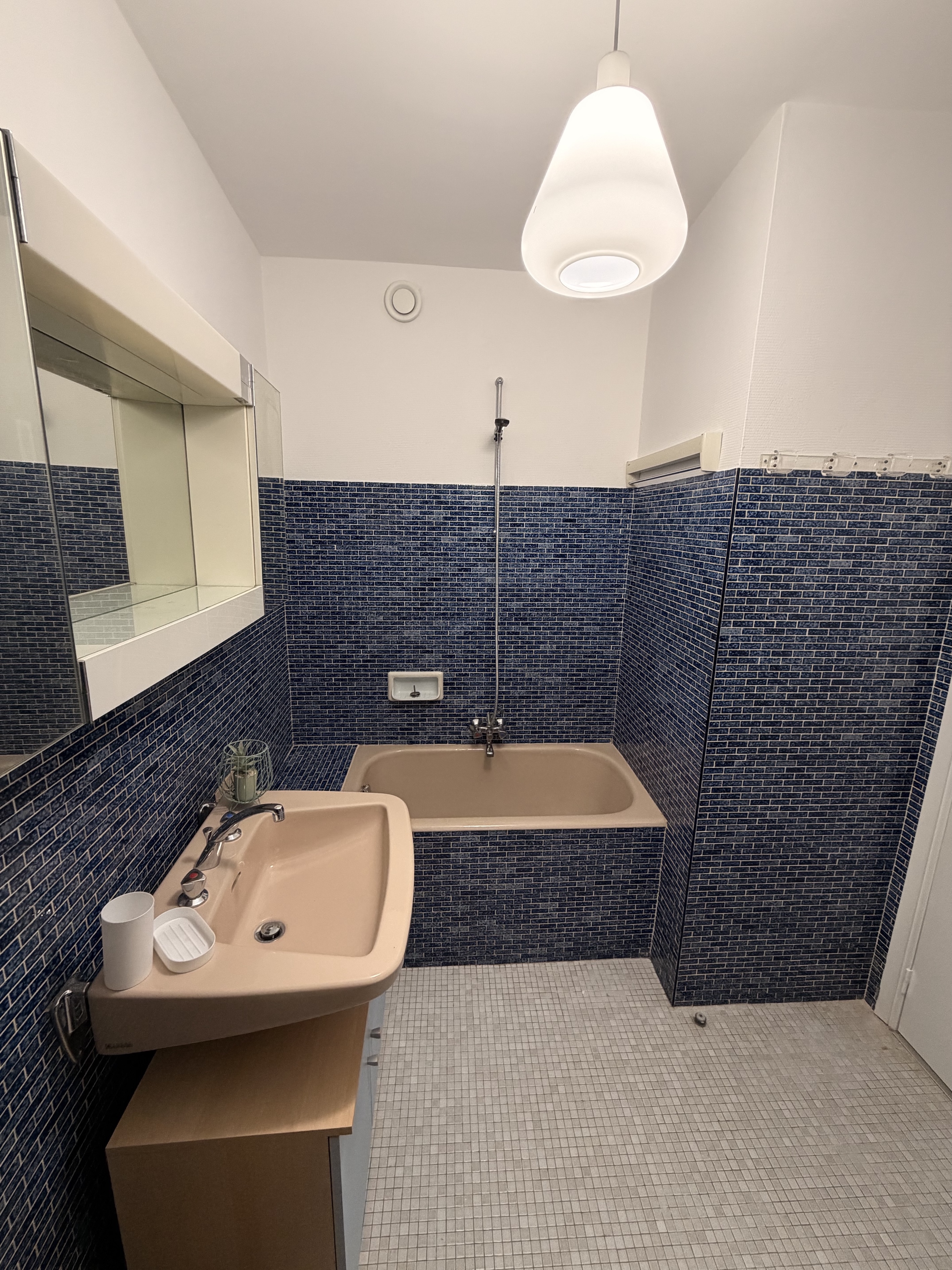 La salle de bain est équipée d’une baignoire, d’un lavabo avec meuble de rangement, d’un lave-linge (Défroisseur), d'un sèche-serviette et de WC.