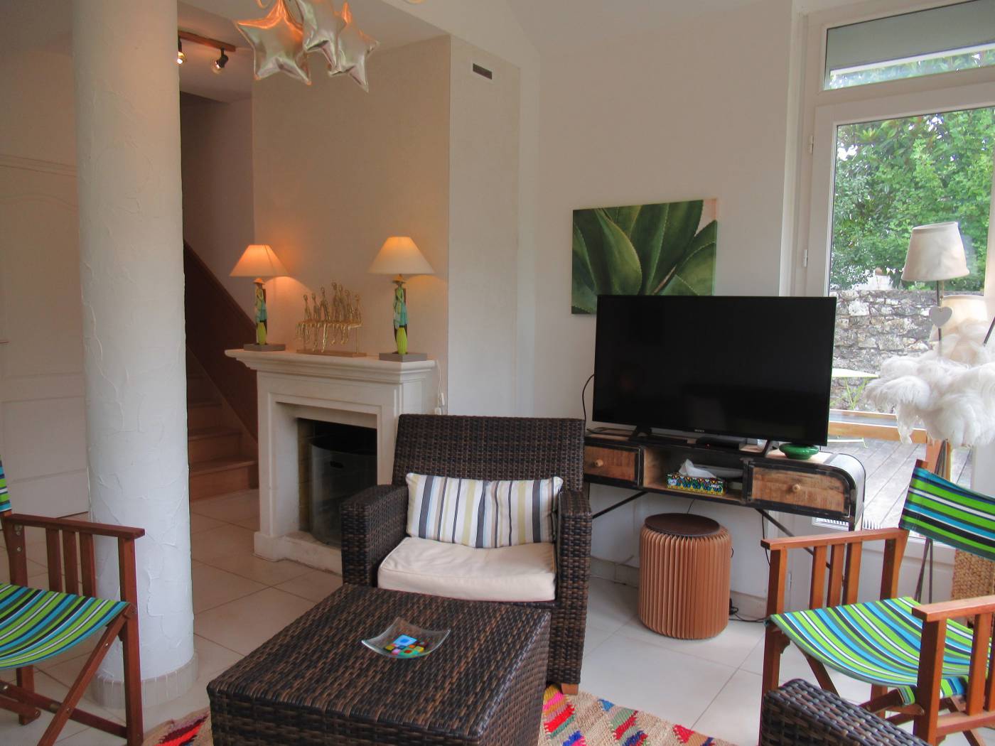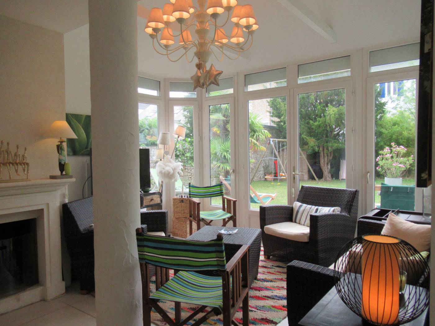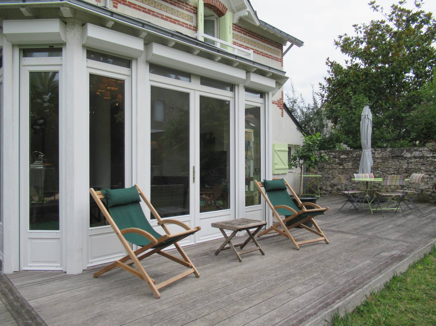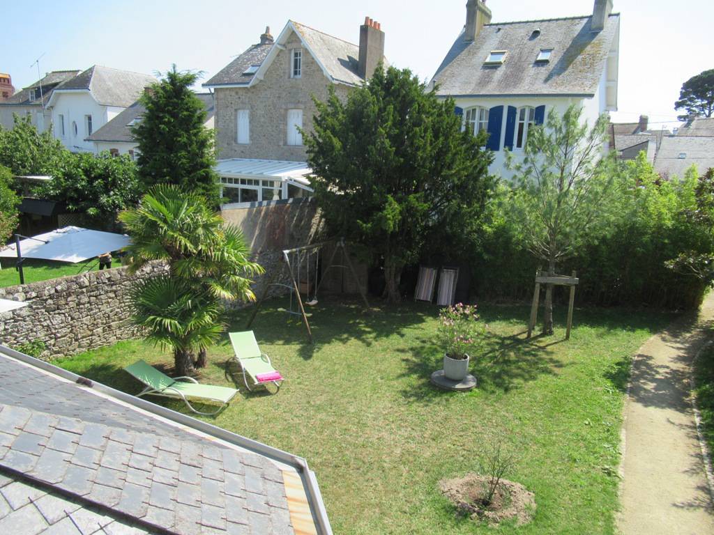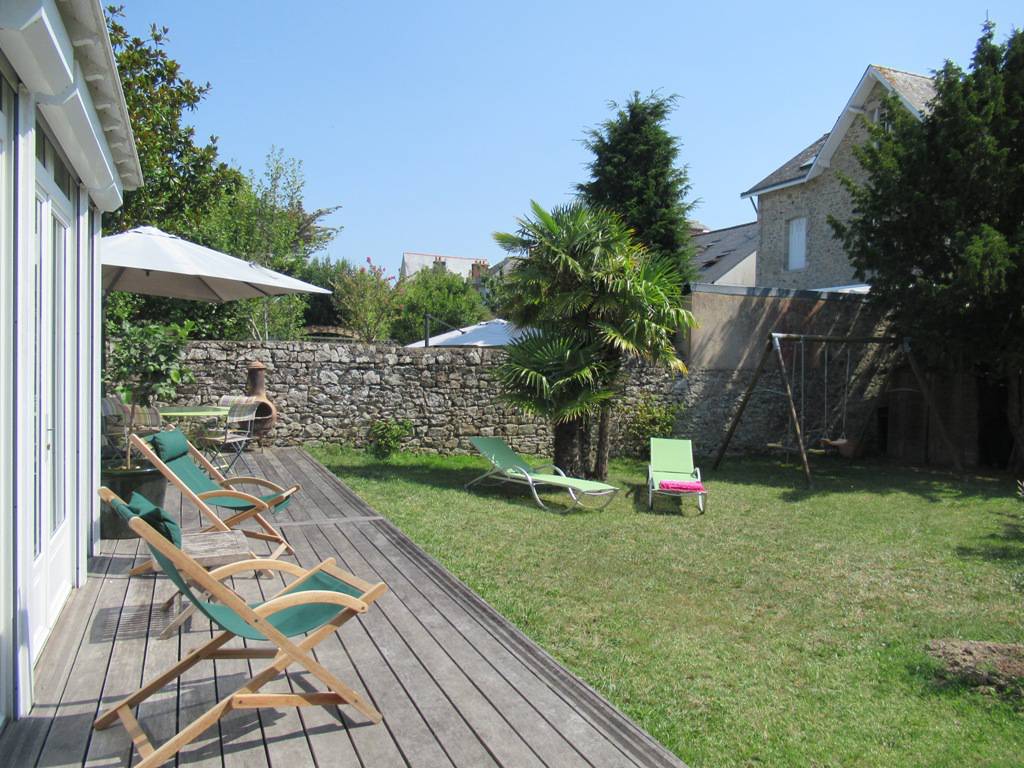 Jardin de 450 m² exposé sud avec terrasse mobilier extérieur + 2 transats et 4 chaises longues - Parasol - Barbecue. CONNEXION WIFI
