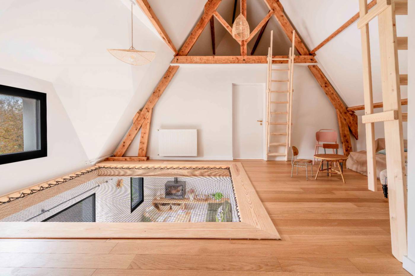 A l'étage : - Chambre 3 : lit 160/200 + placard/dressing + bureau - Mezzanine avec espace bureau - Salle d'eau - WC indépendant - 2 espaces enfant (à partir de 6 ans) sur mezzanine avec 2 lits au sol - Chambre 4 : 2 lits 90/200 ou un lit double 180/200 + placard/penderie